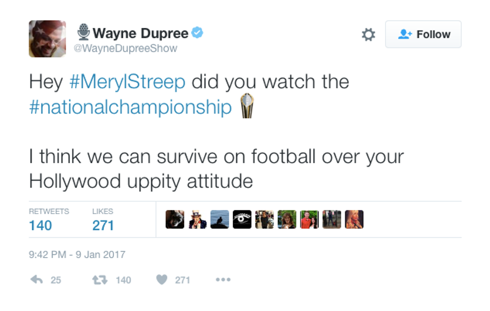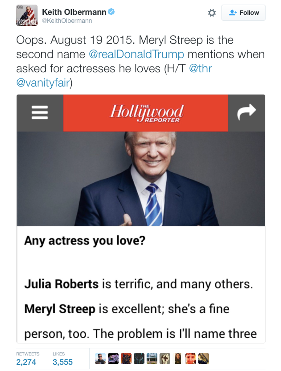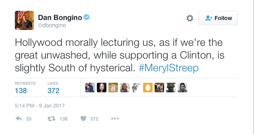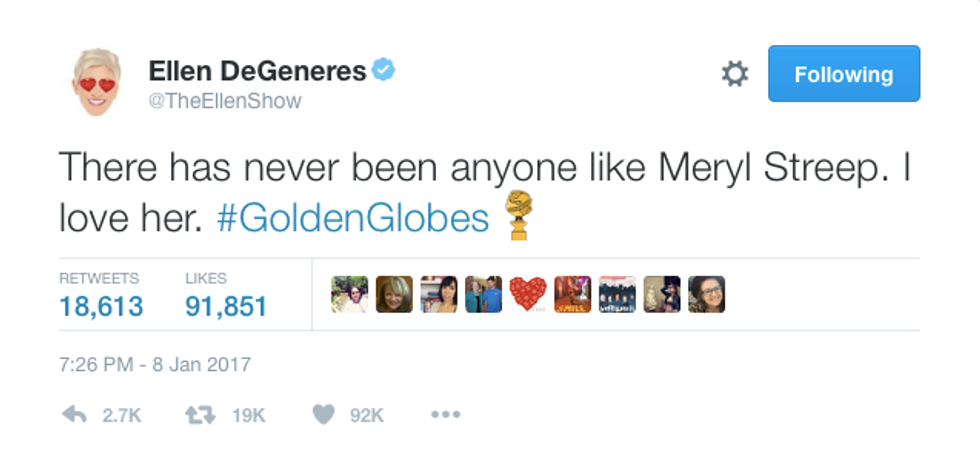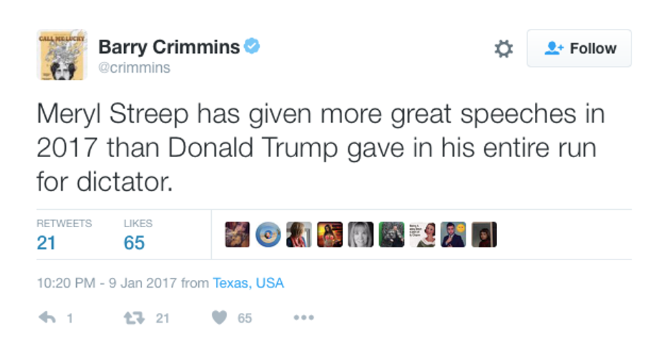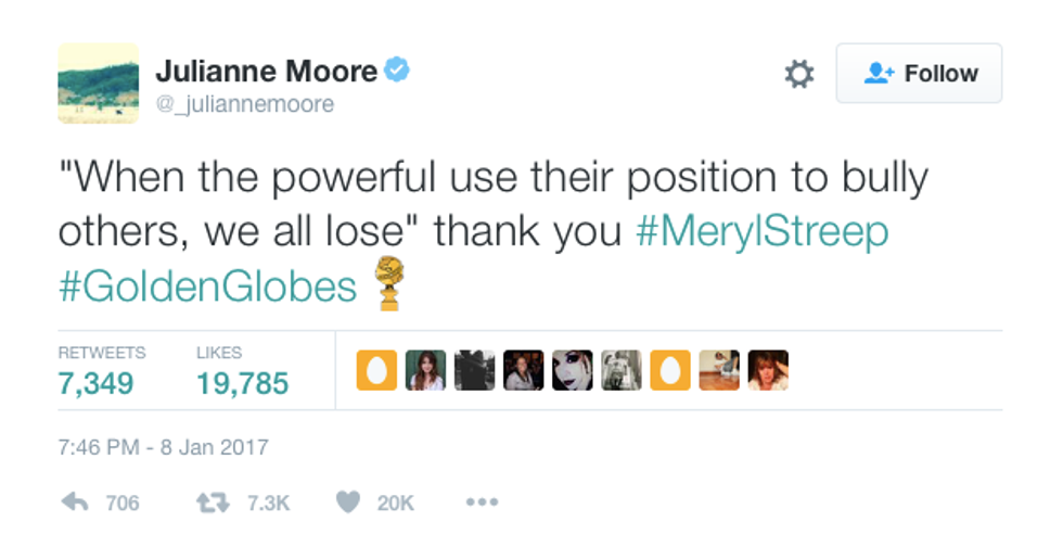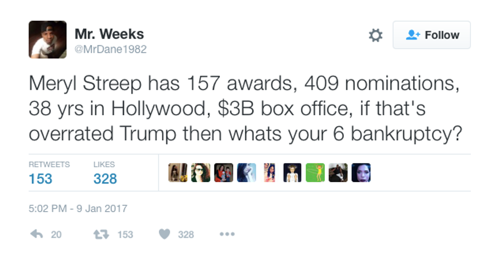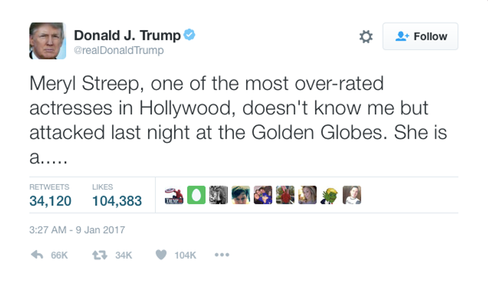I do understand where Trump and his supporters may be left feeling scolded or hurt, but in my opinion, the problem is bigger than Trump's political standpoints, or anyone's political standpoints for that matter. My problem lays within Trump's response to the situation, which might I add was not surprising. Trump has built these walls around the words we speak. We are already living in a world where we are constricted to our thoughts, beliefs and opinions; but Trump is the king of all walls. I know I am not alone when I say that sometimes I feel like I need to keep my opinions to myself because I am too afraid of the response I will receive. I am afraid of bullies. I am afraid to inconvenience the thoughts of those around me. But, here we are. President-elect Trump supports and enforces the reason why I am timid. I am now more scared than ever for the future generations and the uprising of harsh words. My heart is heavy for those who speak up like Meryl did, and get torn down by an overseeing power and their followers. Meryl spoke kind, strong, deeply thought-provoked words and was scrutinized by a 140 character tweet by our president-elect.