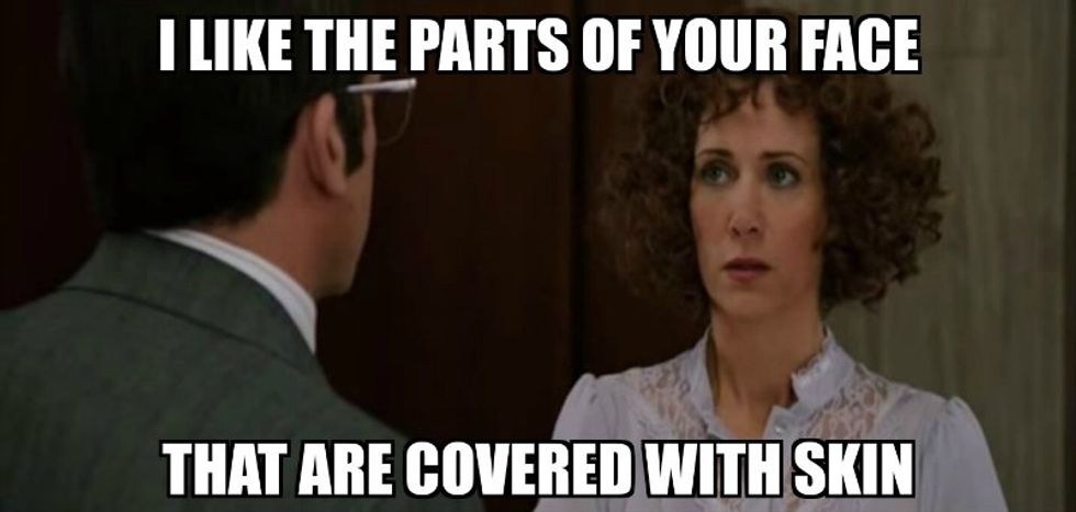 Also, have a laugh...because some of this sh*t she's saying is funny. I'll admit, I think back to when I stumble on my words or say something weird in a text to a guy I like and I laugh! This isn't meaning to say to laugh at her, just laugh with her. Again, she's just nervous and doesn't want to look like an idiot, but she's accepted she might anyway. If she means to compliment your beard for example and she says something like, "I like your beard, it's like a fuzzy hat for your face!" It's funny and probably a little weird for you, but God knows she'll be thinking, "I could've just stopped after 'I like your beard.'" It'll be something funny you can tell friends when you introduce her to your crowd and vis versa. Not to mention, it makes it easier on her because as long as you're laughing, and not genuinely weirded out, she'll be laughing too and hoping you like her still despite her slip ups.
