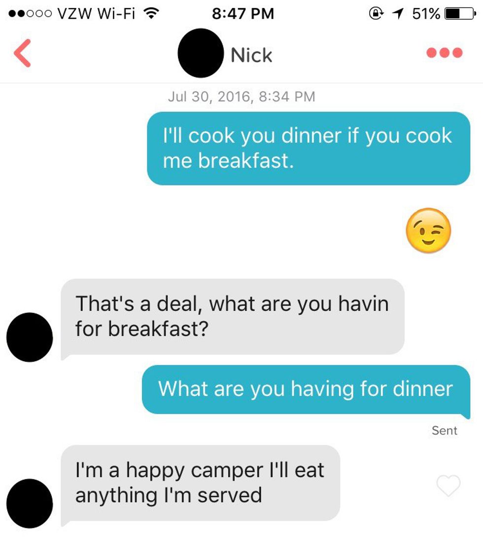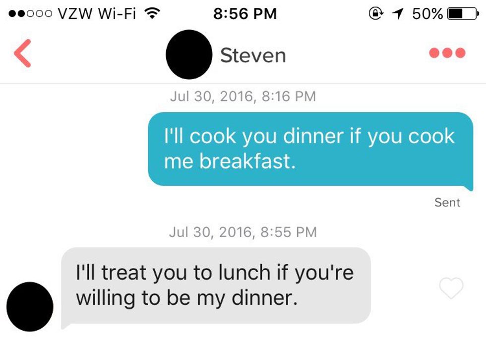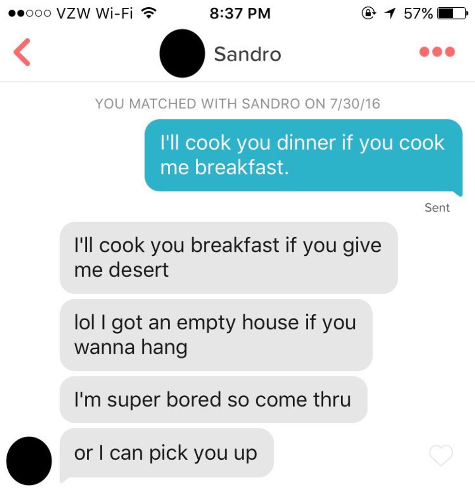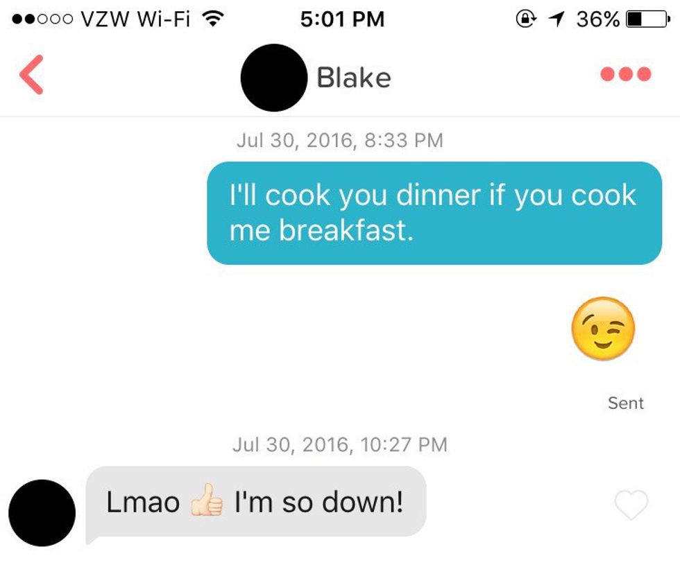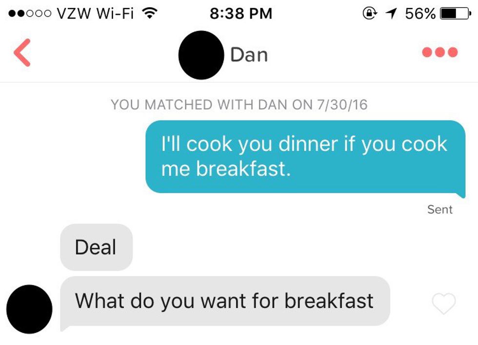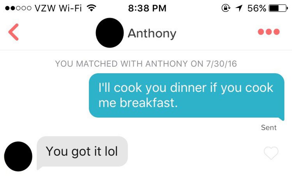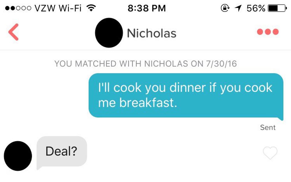 It's been a while since I've been on Tinder. Even when I did use it, I never really "used" it. It's always been a place of experiment to me. What kind of people are out there? How weird is the 19 to 24-year-old population of guys in my area? I never looked for hookups or spending the night with a random guy; it's just always fascinated me how forward people will be with a stranger. For that reason, I decided to do an experiment and document it for your enjoyment. I matched with 50 guys and sent them all the same pick up line, "I'll cook you dinner if you cook me breakfast" and these are some of the responses I got: