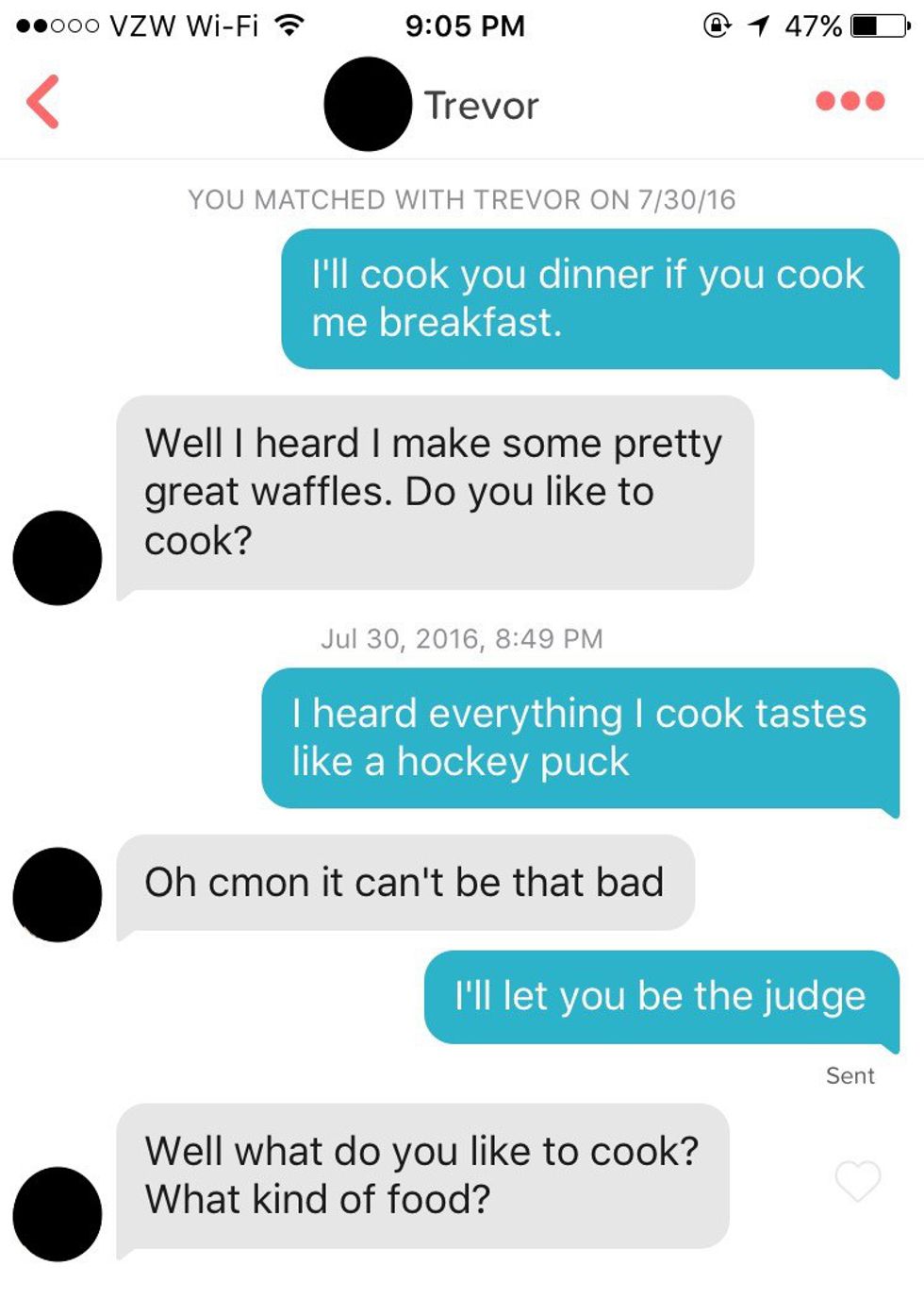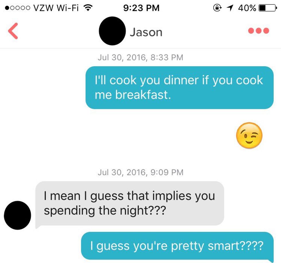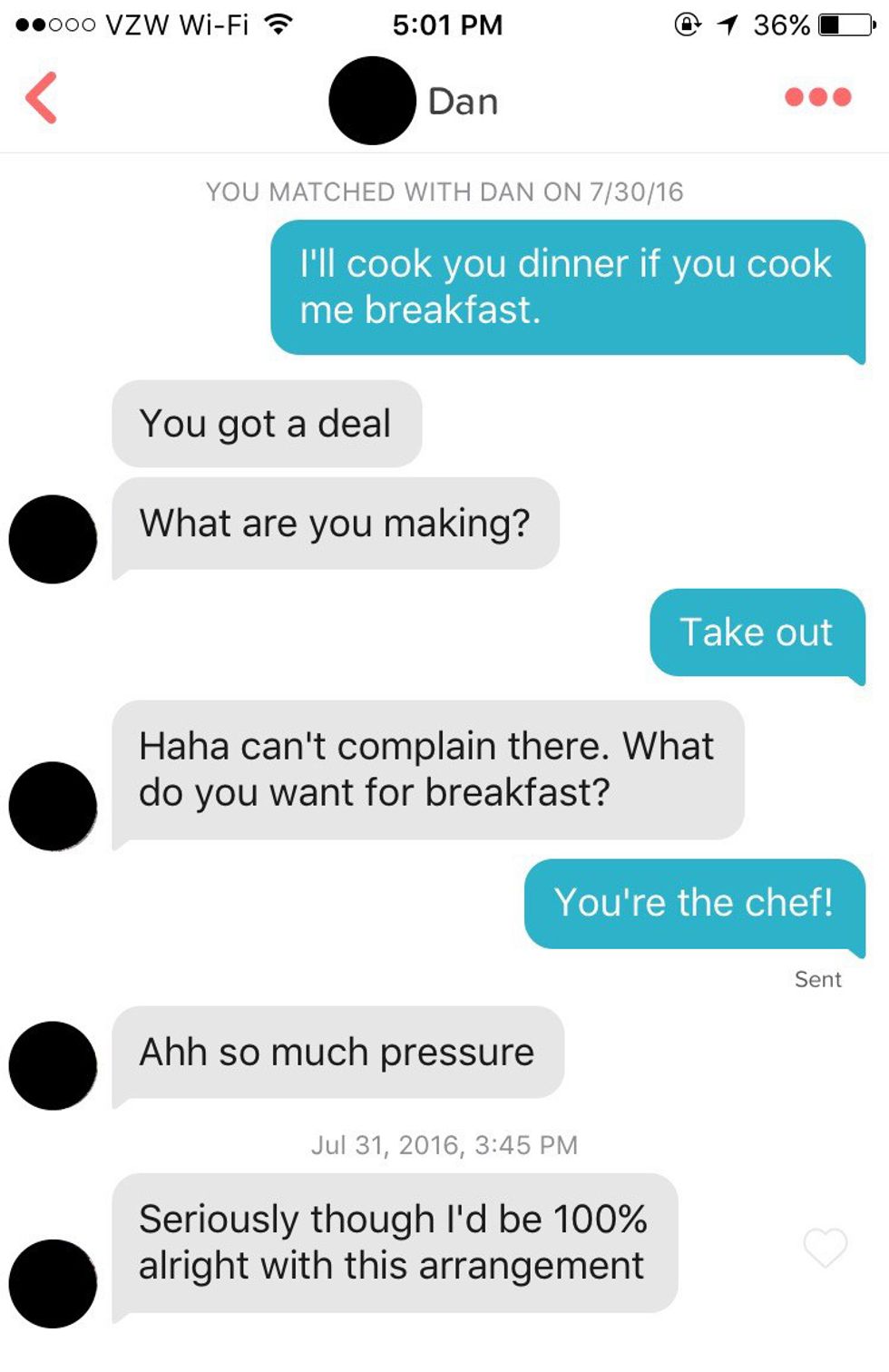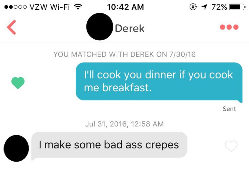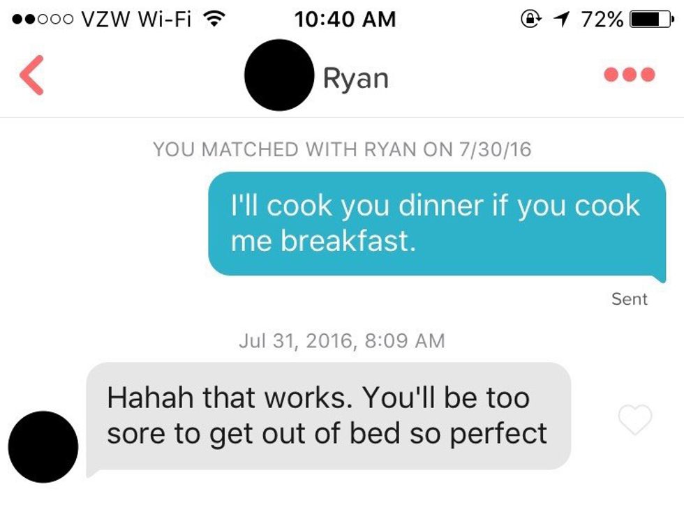It's been a while since I've been on Tinder. Even when I did use it, I never really "used" it. It's always been a place of experiment to me. What kind of people are out there? How weird is the 19 to 24-year-old population of guys in my area? I never looked for hookups or spending the night with a random guy; it's just always fascinated me how forward people will be with a stranger. For that reason, I decided to do an experiment and document it for your enjoyment. I matched with 50 guys and sent them all the same pick up line, "I'll cook you dinner if you cook me breakfast" and these are some of the responses I got: