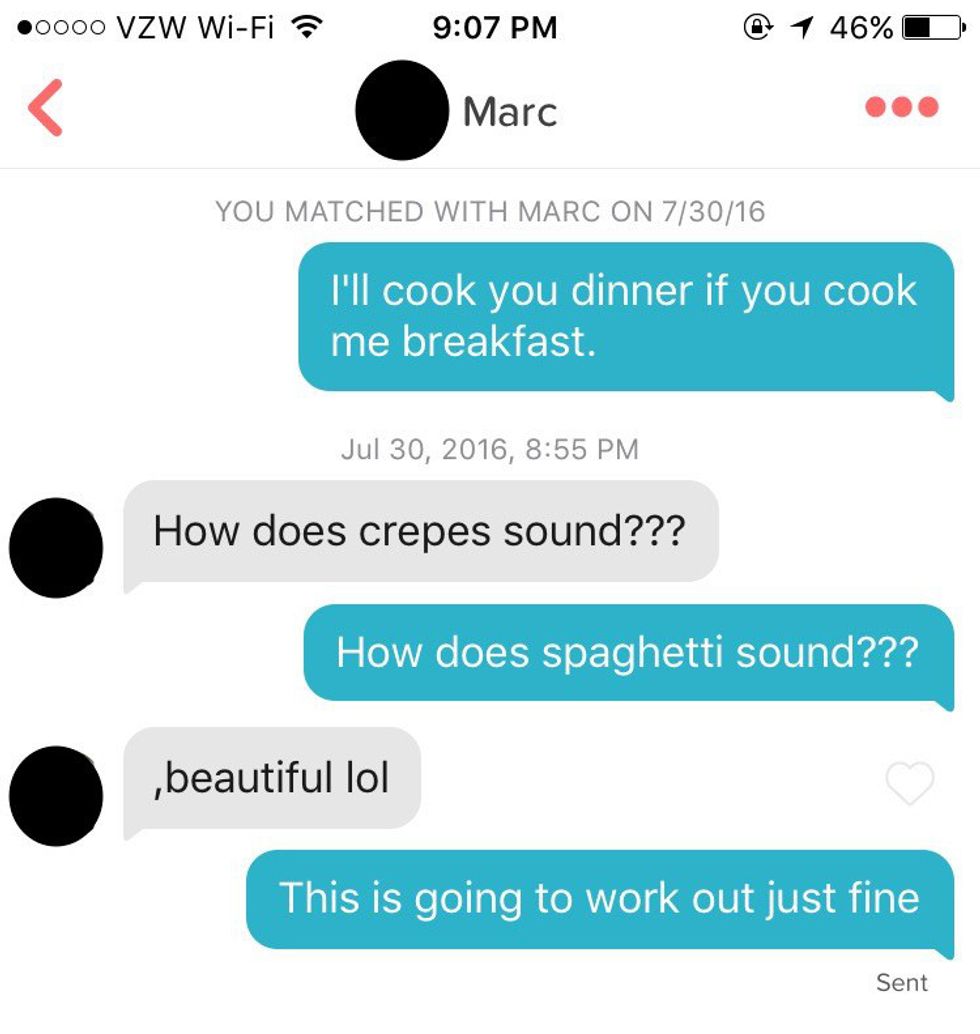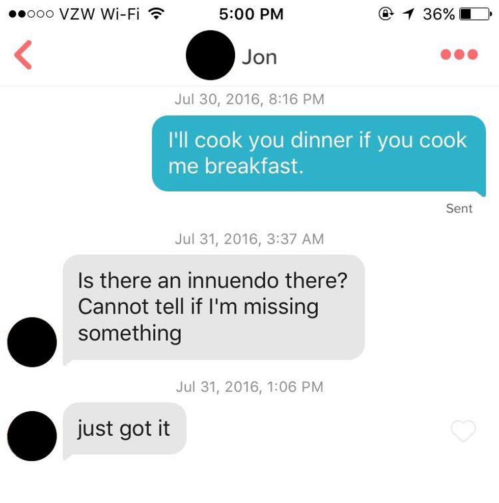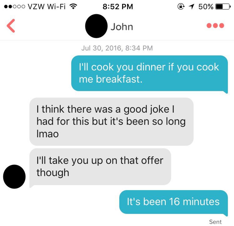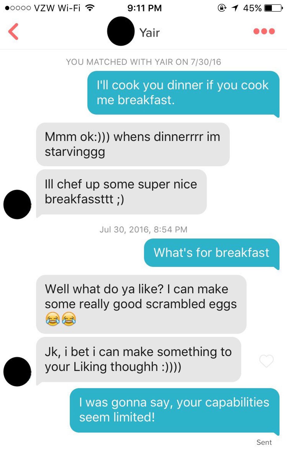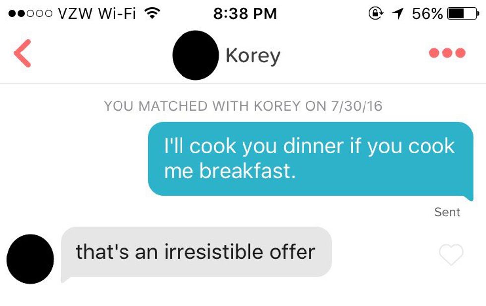 It's been a while since I've been on Tinder. Even when I did use it, I never really "used" it. It's always been a place of experiment to me. What kind of people are out there? How weird is the 19 to 24-year-old population of guys in my area? I never looked for hookups or spending the night with a random guy; it's just always fascinated me how forward people will be with a stranger. For that reason, I decided to do an experiment and document it for your enjoyment. I matched with 50 guys and sent them all the same pick up line, "I'll cook you dinner if you cook me breakfast" and these are some of the responses I got: