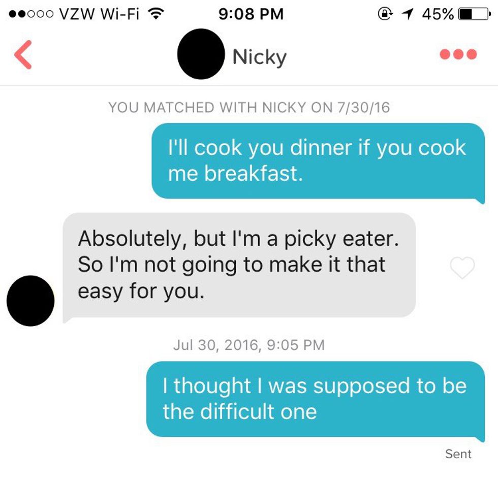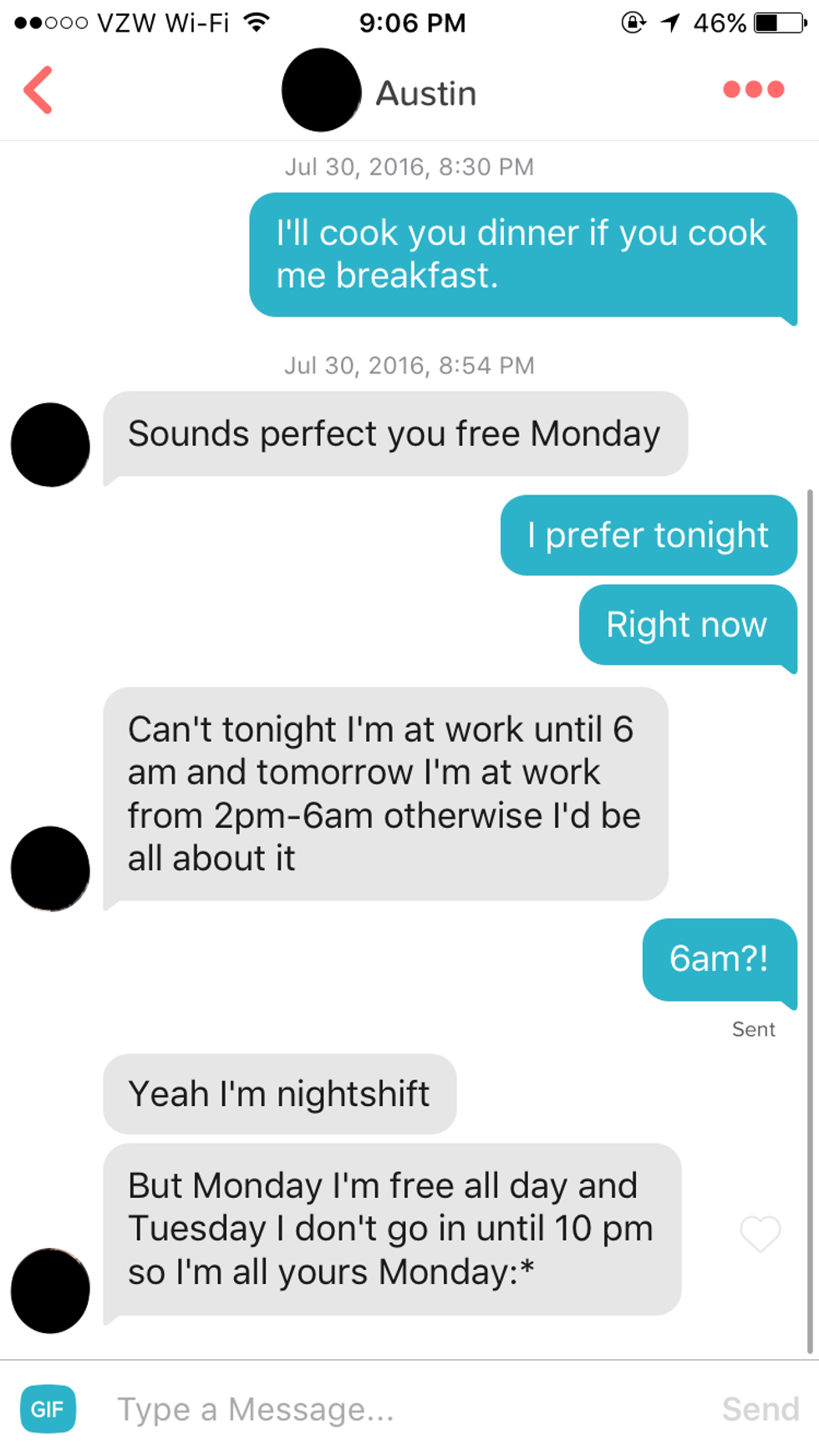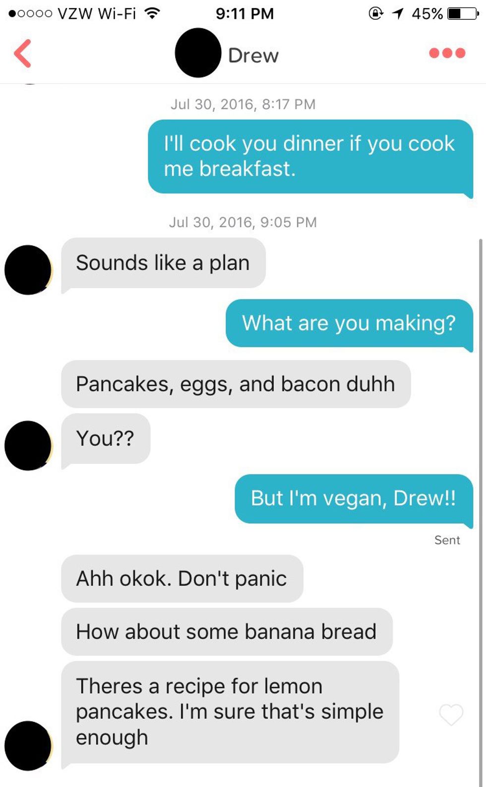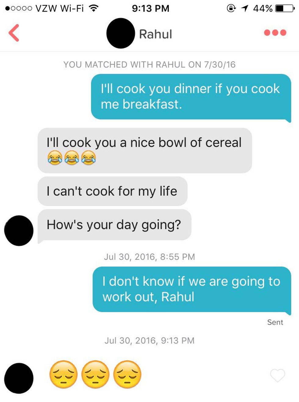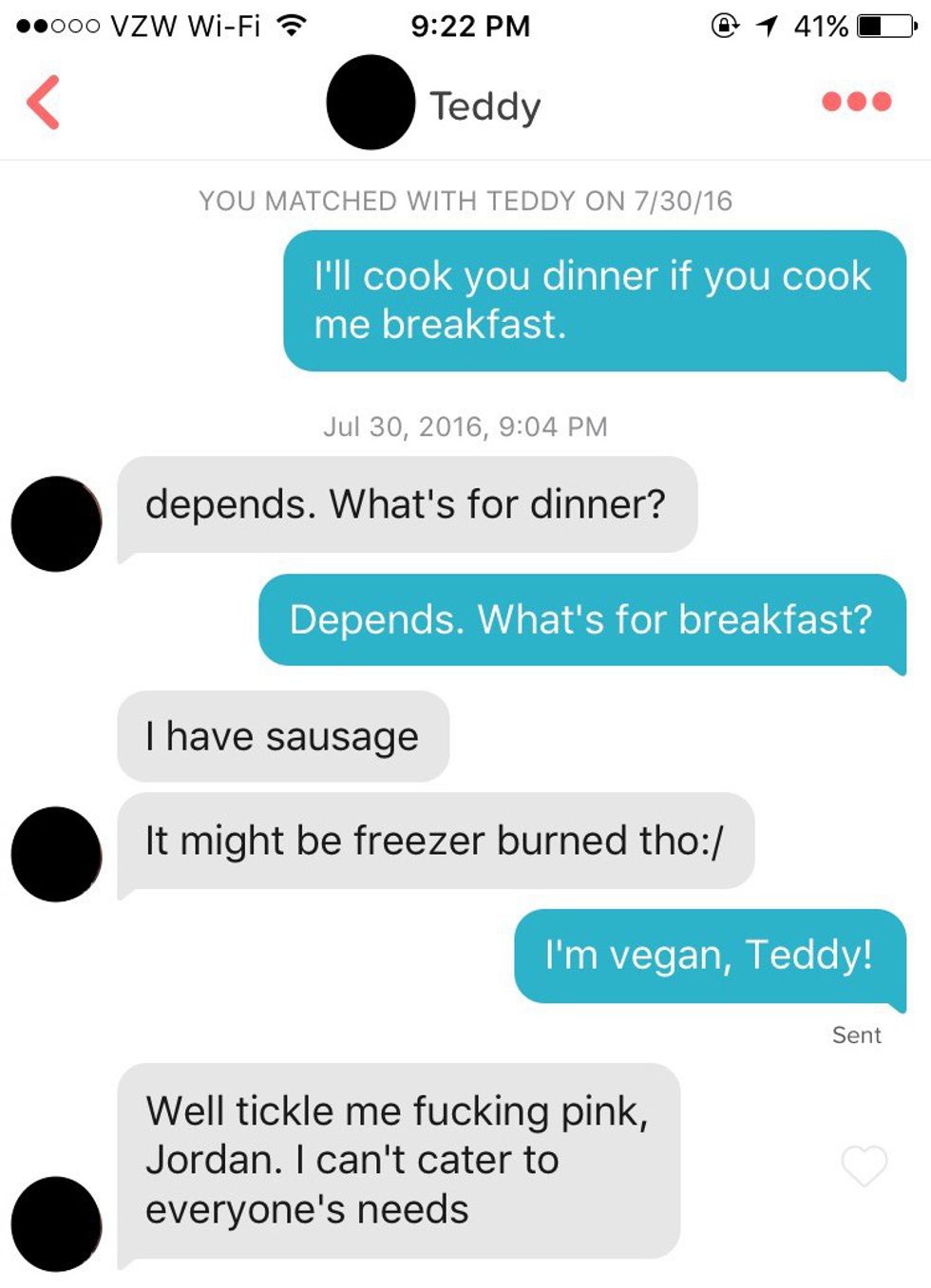 It's been a while since I've been on Tinder. Even when I did use it, I never really "used" it. It's always been a place of experiment to me. What kind of people are out there? How weird is the 19 to 24-year-old population of guys in my area? I never looked for hookups or spending the night with a random guy; it's just always fascinated me how forward people will be with a stranger. For that reason, I decided to do an experiment and document it for your enjoyment. I matched with 50 guys and sent them all the same pick up line, "I'll cook you dinner if you cook me breakfast" and these are some of the responses I got: