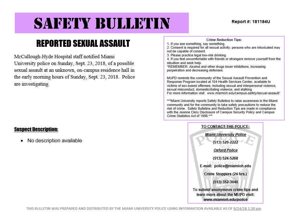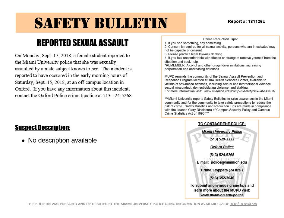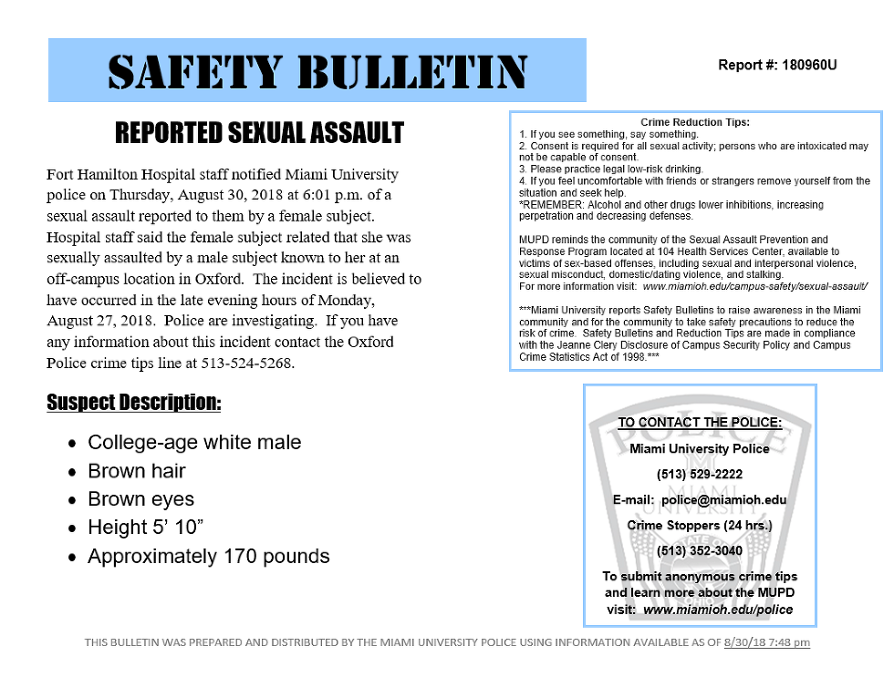 I've heard this from a lot of different students. Whenever an assault is reported, all Miami personnel receive a Safety Bulletin email such as those pictured below. That's usually the last most students hear about it.