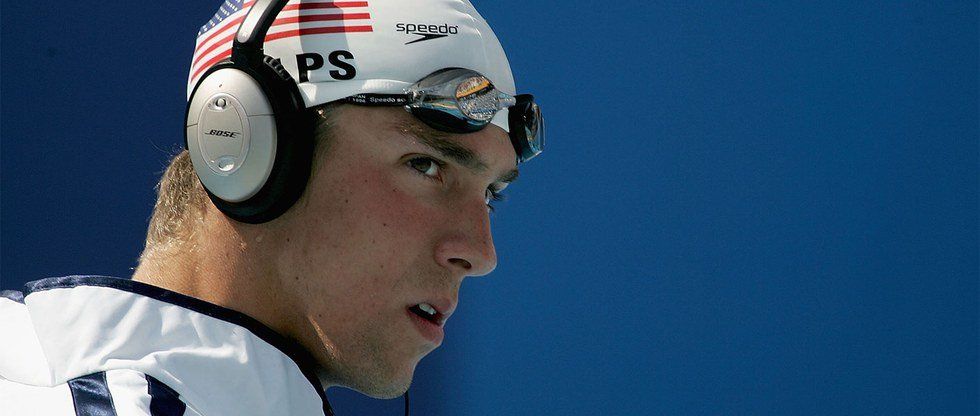 Phelps isn't taking crazy jump shots, but he is always pumped and ready for his races in the pool. I guess you could compare his Men's 200m individual medley to a three pointer.