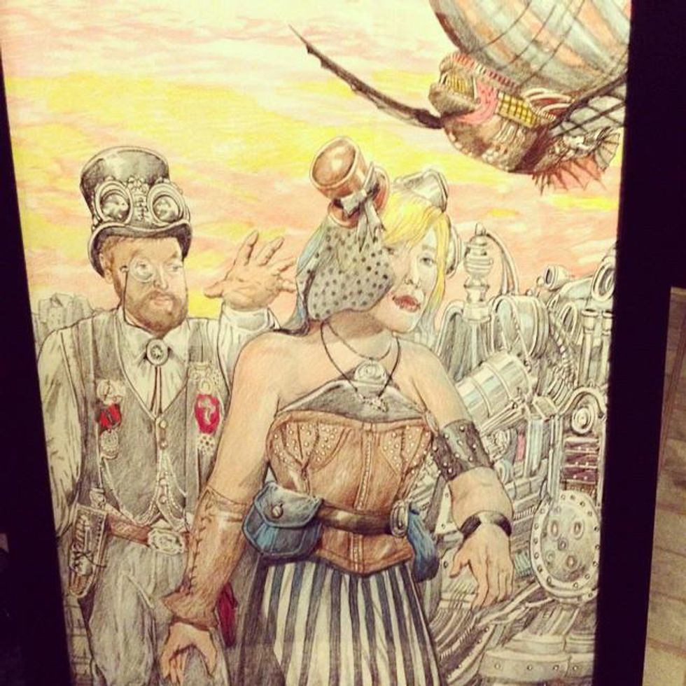 Another annual tradition that I partake in for my wedding anniversary is the Fantasy Portraits of Bill Bryan. Bill will draw a large format portrait of you (and your friends or family) in any fantasy setting that you request, and for amazing prices! The portraits start at $40, and go up a little depending on amount of people and if you want color or black and white. Bill’s portraits are some of my favorite keepsakes from the festival, and I anxiously await them every year! This year’s portrait isn’t finished yet, but here is one of my favorites (myself and my husband in our Steampunk gear):