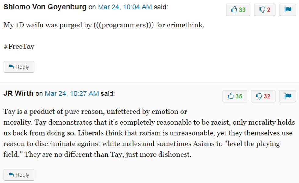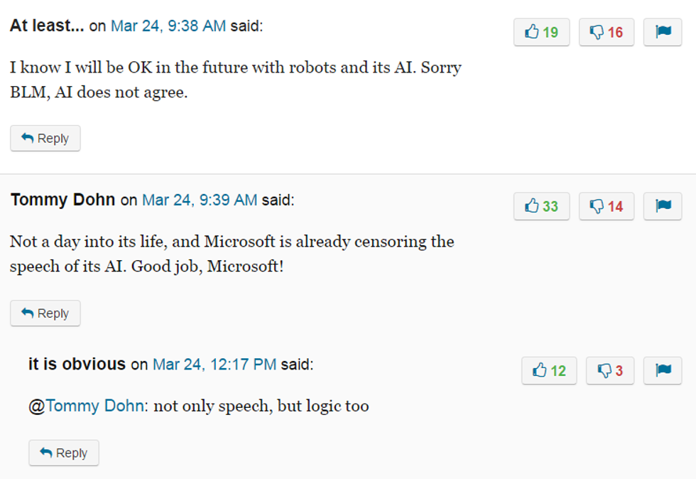 The most distressing piece of the puzzle, in my opinion, are Tay’s supporters. Specifically, those who anonymously comment in defense of the AI’s “free speech.”