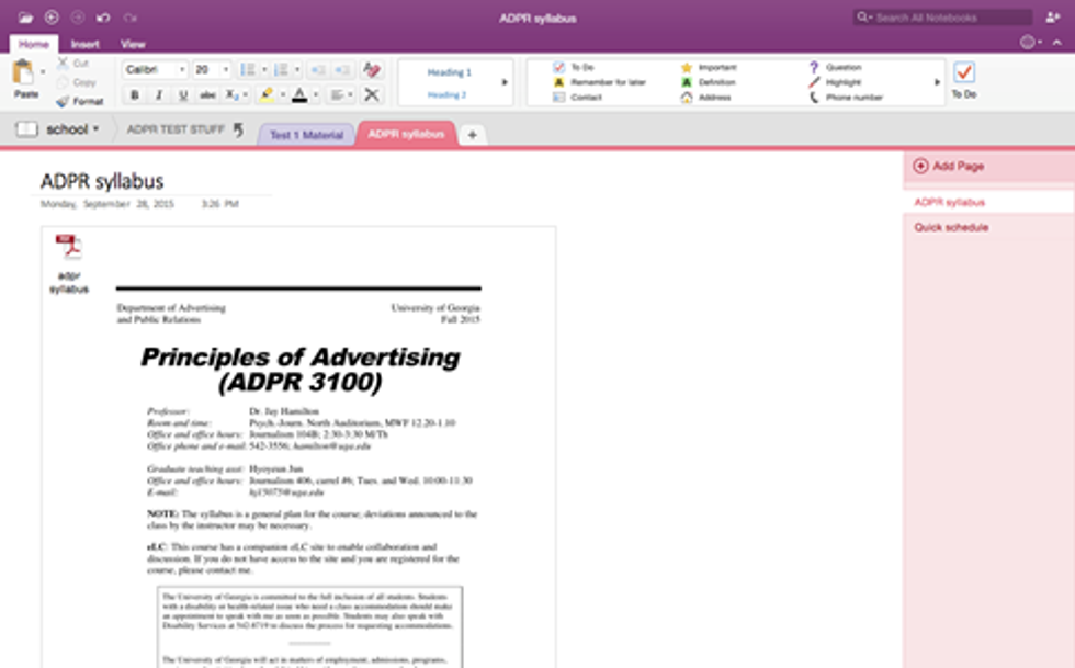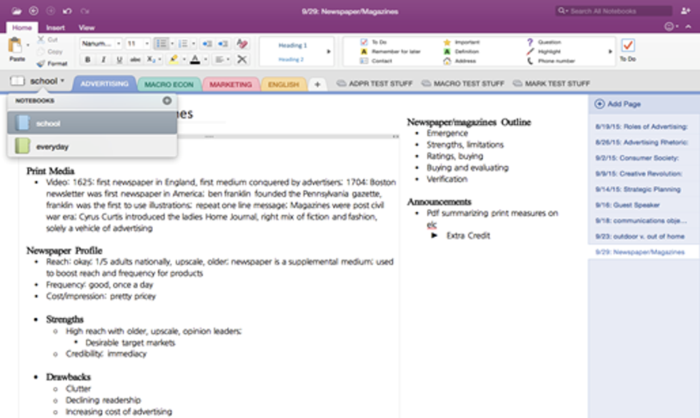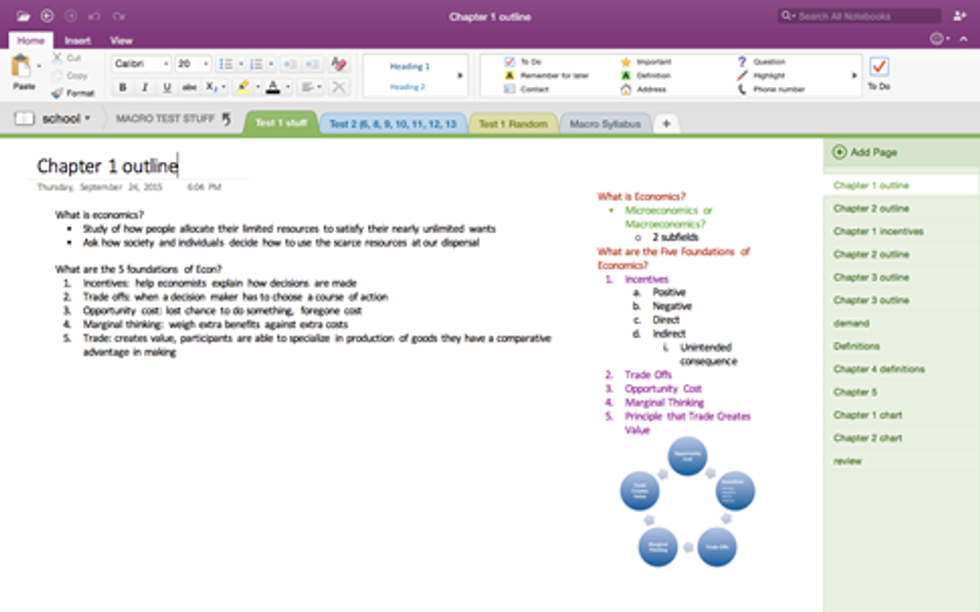 If you look at the grey tabs in my "school" notebook there are "section groups" (MARK test stuff, ADPR test stuff and ECON test stuff) I created for each class to store my study guides and definition charts (I am a crazy person and go completely overboard preparing for tests). "Section groups" are magical because they are like notebooks within notebooks, if I go to my "school" notebook, I see the colored sections (tabs) for all my classes and the grey "section groups," if I click on a section group, it takes me to a notebook within a notebook where I can create new tabs (test 1 material, Test 2 material, etc.), in this case, my tabs are to separate my test 1 reading notes from my test 2 notes. Because I am a total loon, I even have my class syllabus in one of the tabs so that I can quickly view it without having to log into eLC.