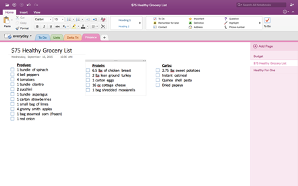 Microsoft OneNote is a note-taking application that can be downloaded on Windows PCs, Macs, IPads, Androids and even iPhones. If you have it downloaded on your phone and computer, it syncs on both so you can view your notes and lists on your phone and computer (swoon). This feature is a lifesaver at the grocery store; whenever I think of something I need during class, I add it to my grocery checklist that I can access at the grocery store later and check off items as I add them to my buggy. OneNote allows you to create digital Notebooks and to-do lists. I have two notebooks; “school” and "every day," but you can create as many as you like!