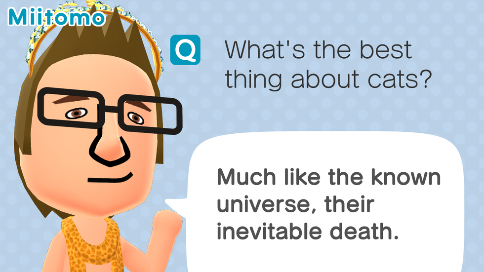 Miis are customizable, using the shop and in-app currency to buy more clothes. In order to get more money, you must answer questions, make friends, have people comment on your posts and even play games. My character is adorned in a tiara, leopard skin scarf, short shorts, fishnet stockings and metallic flats.
