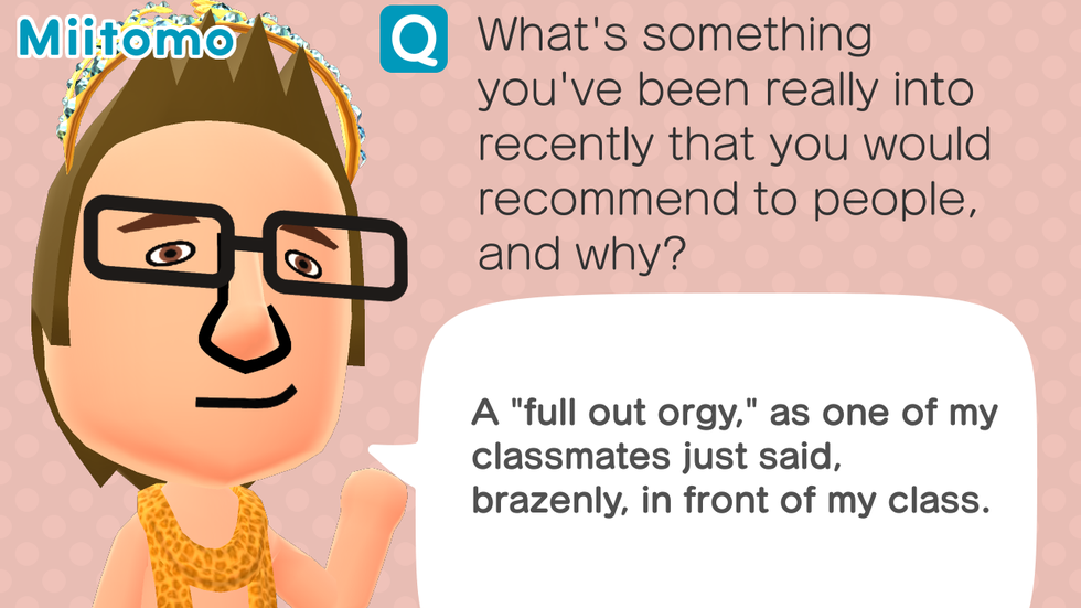 That’s the basic gist of the app. Answer questions, like “What’s your favorite type of bread?” and respond however you want. Customize your Mii to either look like you, or a version of you which happens to be a transvestite—like mine. Make your friends jealous of your answering skills or piss them off with your flippant comments! There is a veritable world of opportunities to be had. So if you want to use your phone for something more than a texting slab or a picture-taker, download this app and make some pals!