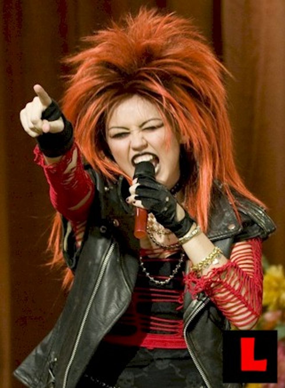 One of Hannah’s costume changes includes a tough leather vest and imposing, red hairstyle, creating a wild, punk look that Hannah longs to achieve. (The absurd costume nearly foreshadows a reputation Cyrus earns years later. Oh, the irony!)