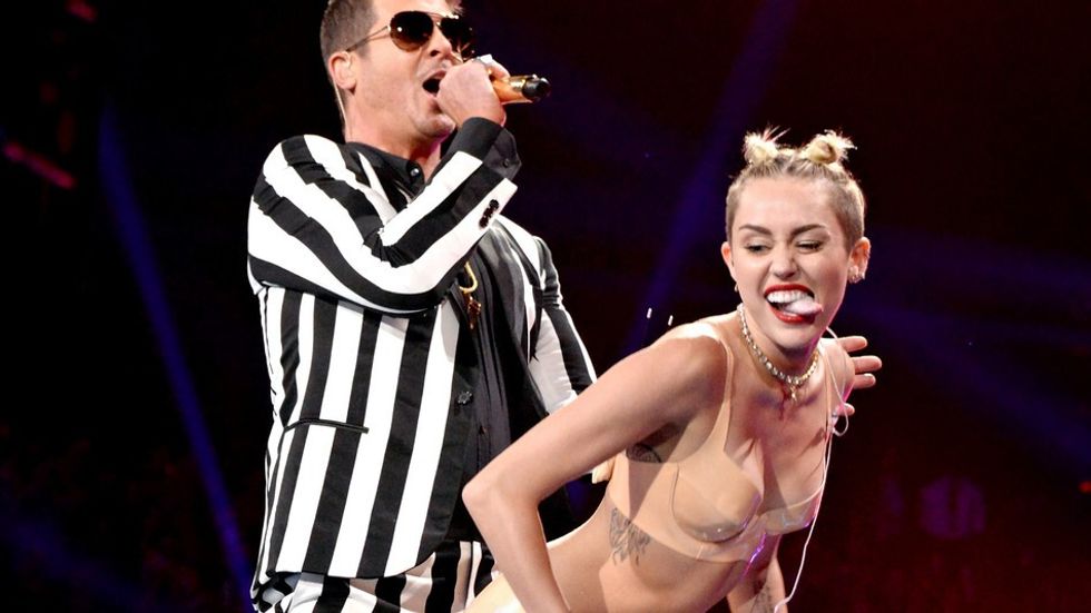 Cyrus sustained her new phase - the grotesque, sexually ludicrous Cyrus - through her controversial Video Music Awards performance in August of 2013. The alternative singer emerged onstage in a tight, low cut leotard, which she soon stripped off to perform in a nude two-piece underneath. Her disturbing gestures with a foam finger and exotic tongue movements only legitimized the outlandish, provocative identity that emerged from her video two months prior, showcasing it front of an audience, on national television, in real time.