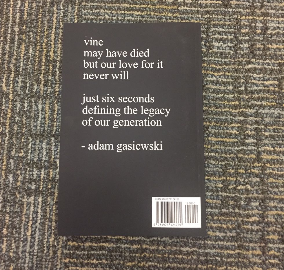 I bought this book at the suggestion of one of my roommates after walked in on me watching three different vine compilations on three different occasions. The goal of self-publishing the book, in the couple's own words, was "just trying to get this book into the hands of as many people as possible, to preserve the culture that Vine fostered" (x). This message is clear by the back cover which reads "Vine/ may have died/ but our love for it/ never will. Just six seconds/ defining the legacy/ of our generation."
