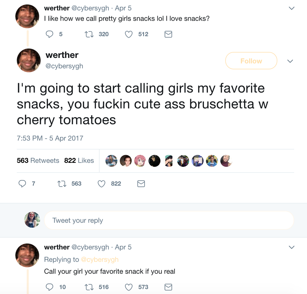 When Twitter user @cybersygh tweeted about calling girls snacks, it started a revolution. Previously, people were calling girls glazed donuts due to makeup causing that glow. Now, boys are calling girls grilled cheese - how cute.
