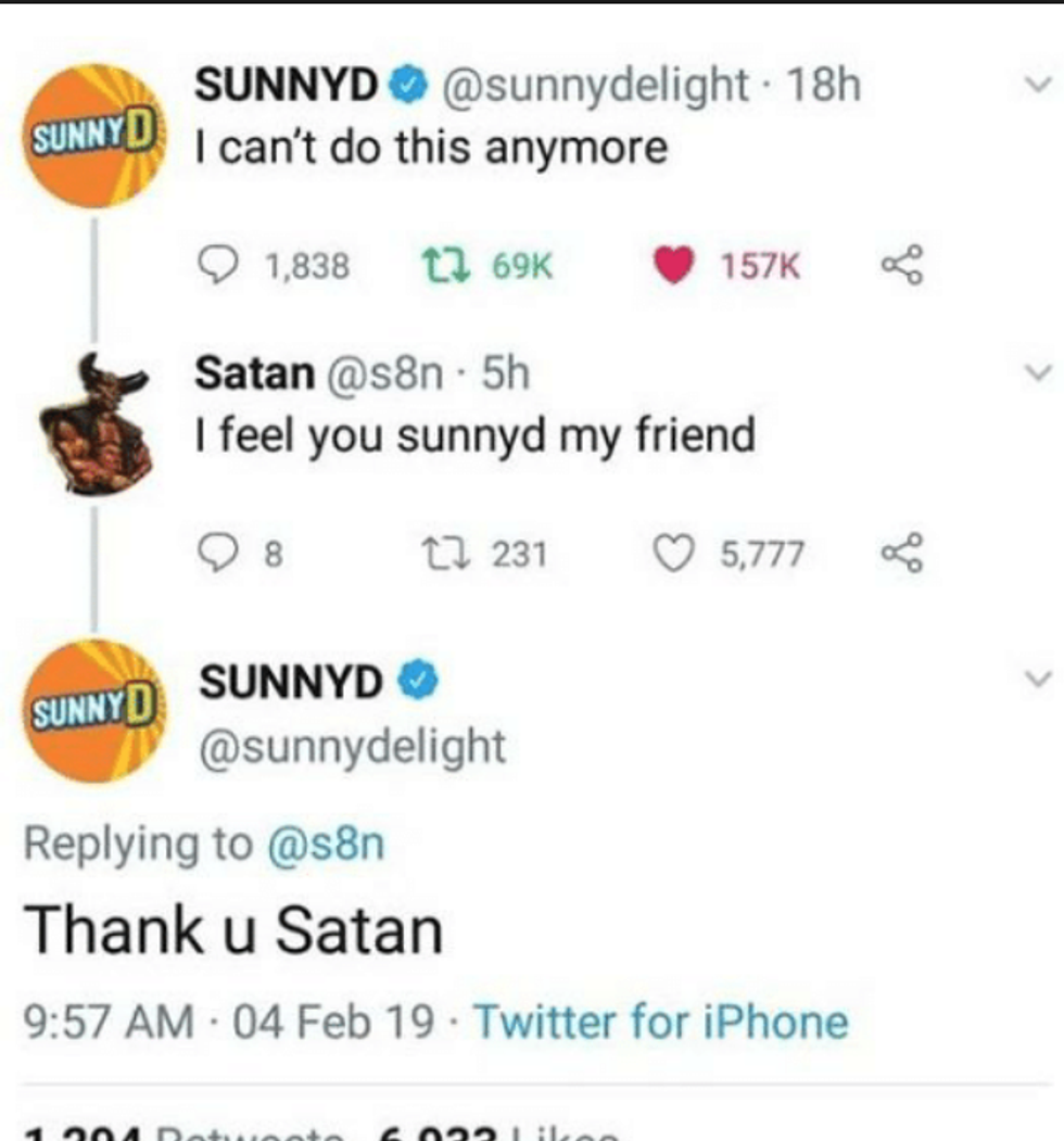 2019 is cool because all the legacies are on Twitter being friends. Satan and Sunny D? Hell yeah! I feel that bro!
