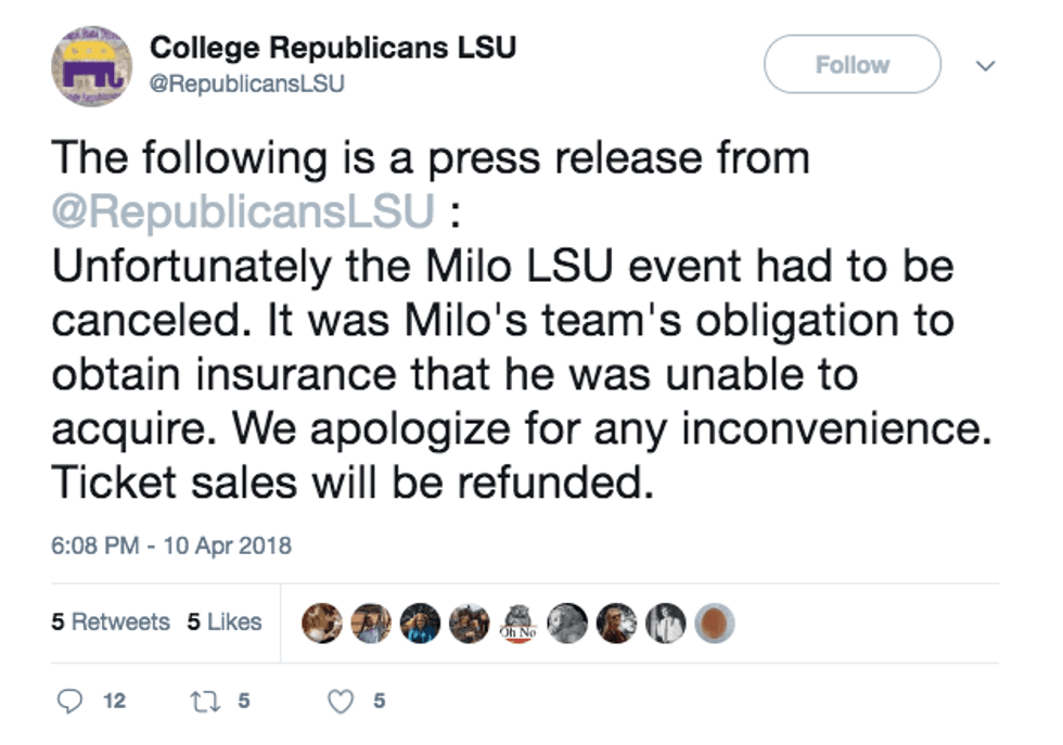 LSU's College Republicans had scheduled Yiannopoulos to speak to their organization on campus and even sold tickets to the public. However, Milo Yiannopoulos will no longer be speaking at Louisiana State University. It is believed that his team did not pay insurance costs for the event. The LSU College Republicans are refunding all ticket purchases.