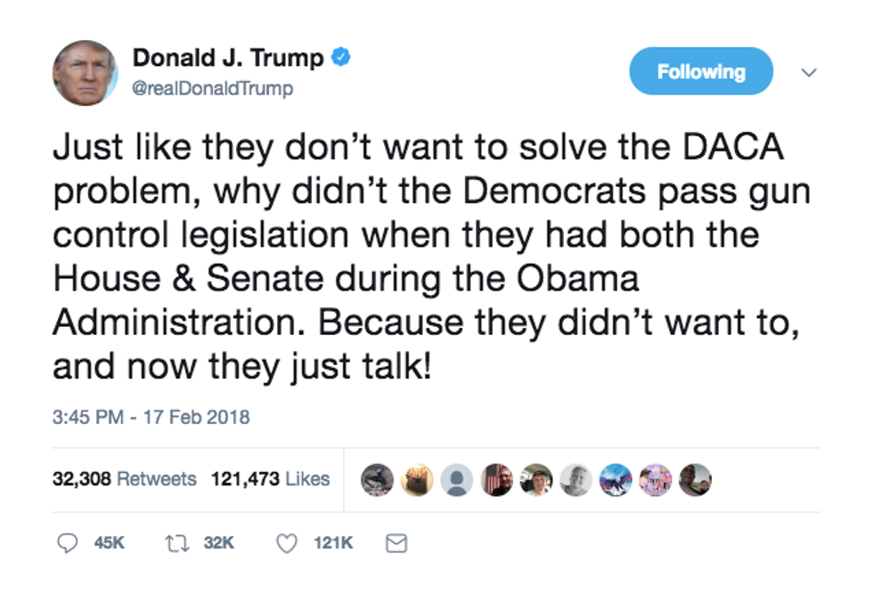 Below is a tweet sent out by Pres. Trump on February 17, 2018: