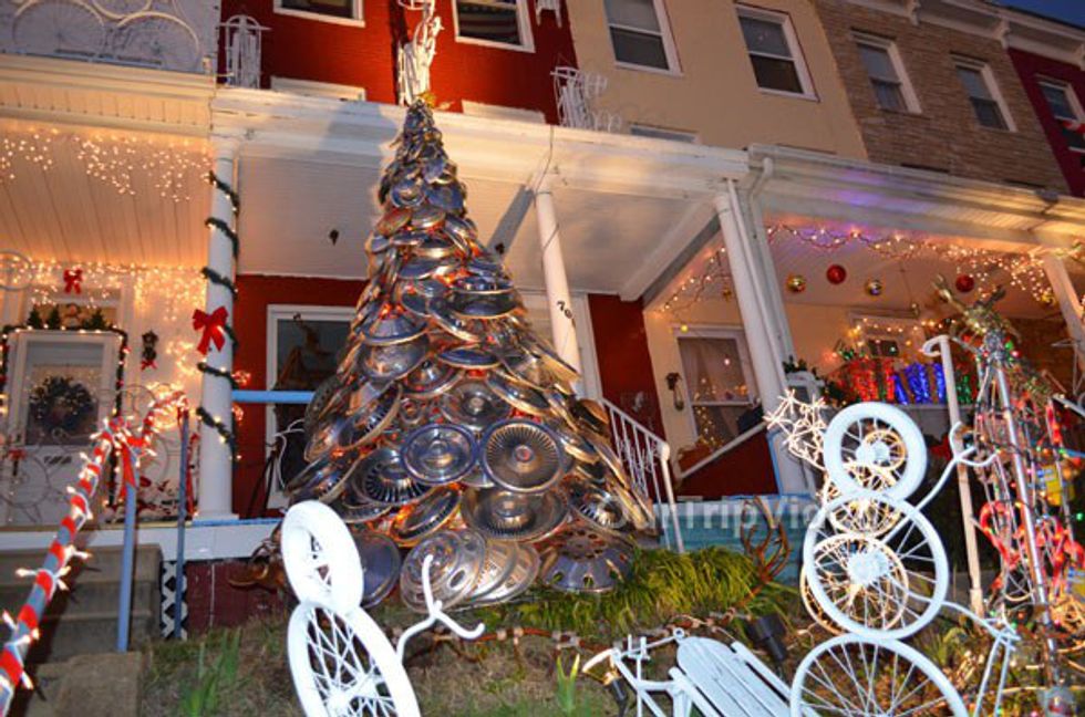 But these holiday decorations are not just your ordinary multi-colored bulbs on a string. On 34th Street you'll find houses with hubcap Christmas trees, bicycle wheel snowmen, peace-themed decorations, and light displays that pay homage to notable Baltimore icons: crabs, National Bohemian beer (aka Natty Boh), the Utz girl, and of course, the Ravens and Orioles. Walt Disney cartoon characters and Hanukkah menorahs light up front porches and lawns, but these houses would not be complete without their fair share of Santas and Frosty the Snowmans as well.