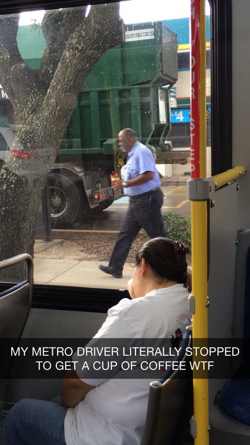 Day 2: I was four minutes late to class. My bus driver also got off the bus and actually got coffee AT A GAS STATION for four minutes. I kid you not. I noticed the bus wasn't moving after two rounds of cars had passed the green light and looked to the front of the bus. No driver. IS THIS EVEN ALLOWED???