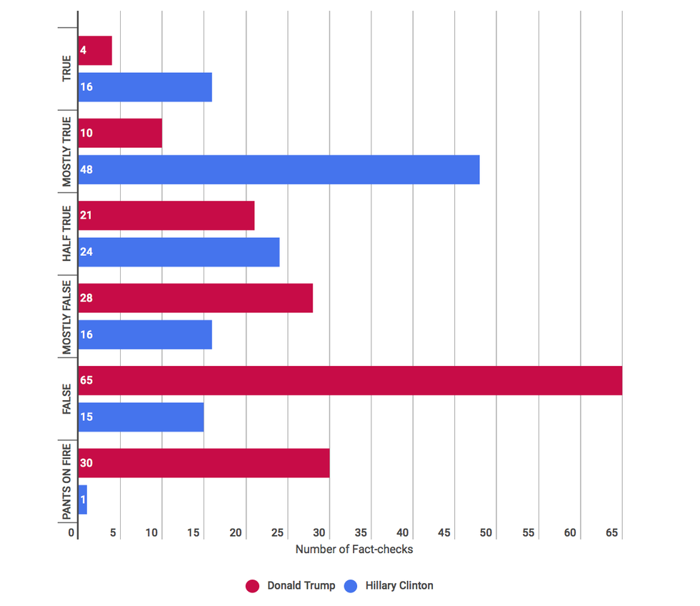 I Googled ‘Trump vs Clinton fact checker’ and, according to Politifact, out of 278 facts that were checked from both candidates (158 from Trump and 120 from Clinton) 65 of Trump’s facts were ‘False’ as opposed to Clinton’s 15. And if that wasn’t bad enough, 30 of Trump’s statements were ‘Pants on Fire’. Meanwhile, Clinton had one.