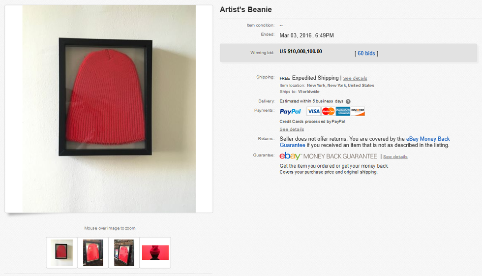 So now that we have had a chance to see what my IB education has done for me, I would like to review. In my analyses I simply looked at the defining features of the work. I decided on a "theme" that the work expressed. For Mondrian it was the black lines and the colored squares, and for Pollock it was the messiness of the piece. I then simply tried to fit an explanation to the piece. I decided both pieces should comment on an aspect of society, so I found a way to have each piece reflect that commentary. I then combine the aspect of the piece with my perceived commentary to create my "analysis." I added Mondrian's black lines with the Blank Slate theory of psychology and found a piece that comments on societal struggle. I added the chaos and contrast of Pollock's piece with information regarding the time period it was created to make a very simply commentary on the basic conflicts of World War II, the most well known human conflict ever. I chose Ethan Klein as my last subject to highlight how ridiculous analyzing art can be. While I may or may not have made a creative argument in one direction I chose Ethan's piece because he is a Youtuber who made his "art" for a video that made fun of modern art, and more specifically the analysis of it. He also attempted to sell "Artist's Beanie" for a cool $1 million, as in the video he states that the point of modern art is to make easy money. You can view Ethan's Ebay sale below. In closing I want to highlight a point. I did not write this article to show that all art analysis is pointless but rather to suggest that art can be interpreted in whatever way you wish, the point is simply to think.