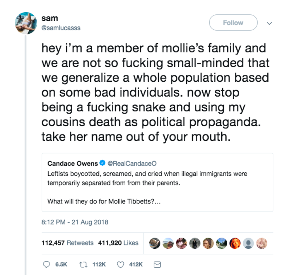 Furthermore, it's fair to assume that Mollie would be appalled that people are using her death to justify anti-immigrant sentiments. Mollie's family members themselves have pushed back against such ideas on social media: