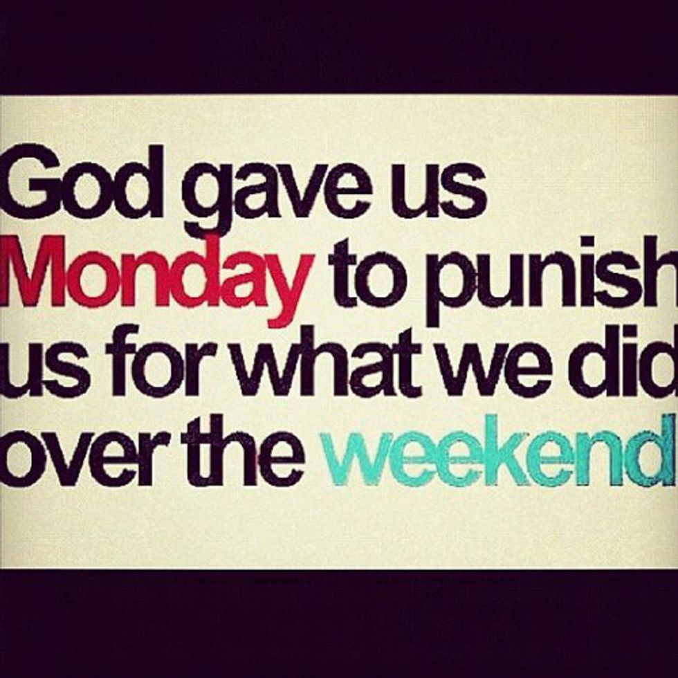 I'm gonna go out on a limb and say that every college student agrees with me here: Monday tests were probably the worst invention for college kids. In your mind, it sounds fantastic because you are supposed to have two days to study for the information instead of one, but instead of actually studying you find reasons to do anything, but study. Slowly the stress of the test begins to gnaw at you and you want to just take it and get it over with because if you see the study guide one more time you'll cry. So tests any day of the week are pretty awful, but I would have to say I hate Monday tests the most.