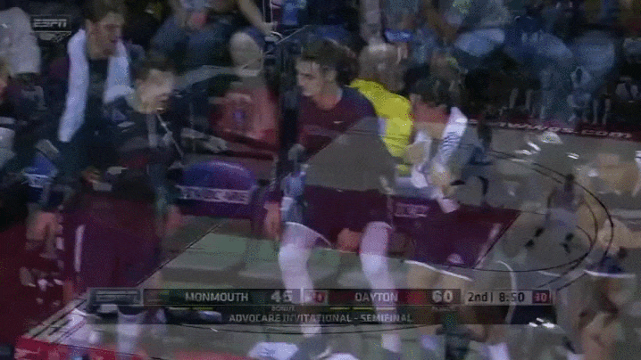 The bench is led by Daniel Pillari, Greg Noack, Louie Pillari, and Tyler Robinson, who meet after team practices to brainstorm new routines. Noack keeps a card with a list of celebrations in his sock that determine what they will do after the next big play.They've become so popular that cameras immediately zoom to the bench after the team scores. The Monmouth bench even has a Twitter account with over 12,000 followers. Former Wisconsin star and current Hornets center Frank Kaminsky III tweeted, "Monmouth's bench mob is my spirit animal." Check out some of this bench mob's most creative celebrations below.