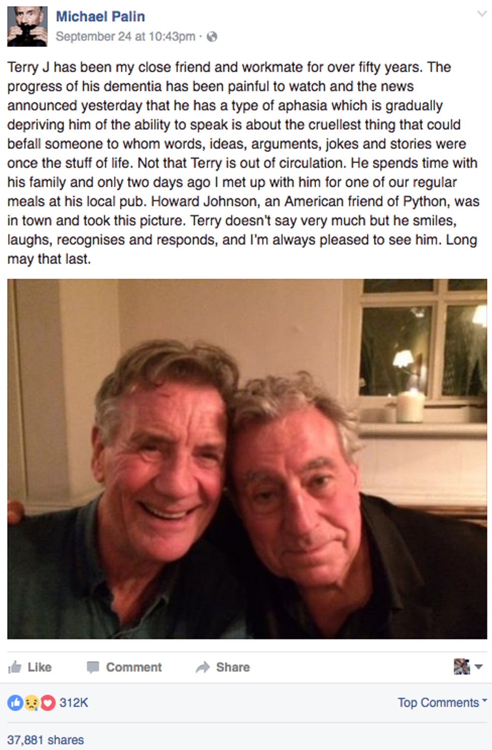 It was recently announced that former Monty Python cast member Terry Jones, 74, was diagnosed with a rare and aggressive form of dementia which has begun to make communication extremely difficult for him. The disease is gradually taking away his ability to speak and express himself - a terrible thing to happen to anyone, especially a revered comedian.