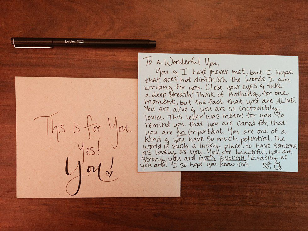 Everyone needs kindness in his or her life. To be reminded that they are loved, that they are wonderful, brilliant, and beautiful people. We can’t possibly be told that enough. Share your love, and show a stranger that we are all enough just as we are.
