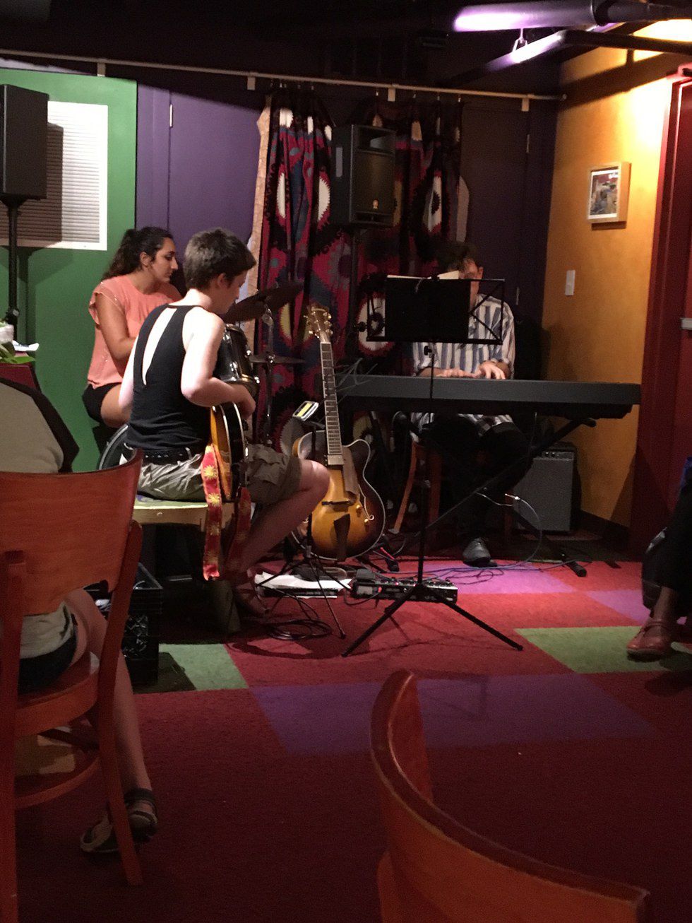 Here is some background information about the performers: They all graduated from high school last June (like I did). They were a part of the school’s jazz band. One day they happened to jam together which turned into a jazz band within a jazz band. The trio already has a few recordings. The names of the members are Jory, Neda, and Tristan. Jory plays bass, Neda plays the drums, and Tristan plays electric guitar and piano.