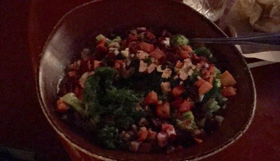 A few minutes into seeing the performance, my dish came. In my bowl were tofu, beets, kale, broccoli, carrots, and brown rice topped with Ginger Nama Shoyu Sauce creating a beautiful blend of colors. There are certain vegetables I really do not like such as mushrooms, eggplant, and peppers so I had a feeling I would not like beets despite wanting to eat them after seeing them on TV as a child. So I chose to eat everything in my bowl except for beets. But eventually, I asked a friend what beets taste like and she said they are very sweet. Then, I began eating the beets and thought they were yummy. I guess I can say my life is complete now.