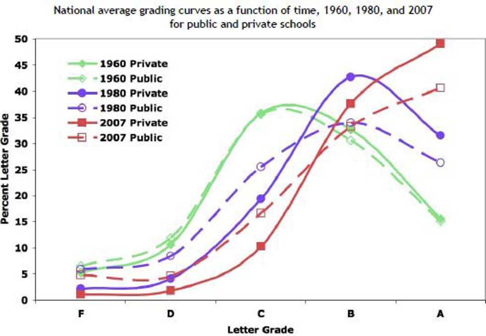 According to the national average, since the 1960s, there has been a significant growth in the number of A's distributed in the classroom. In '60s private and public schools, the number of A's given was less than 20 percent. In 2007, the number of A's distributed skyrocketed to around 50 percent in public institutions.