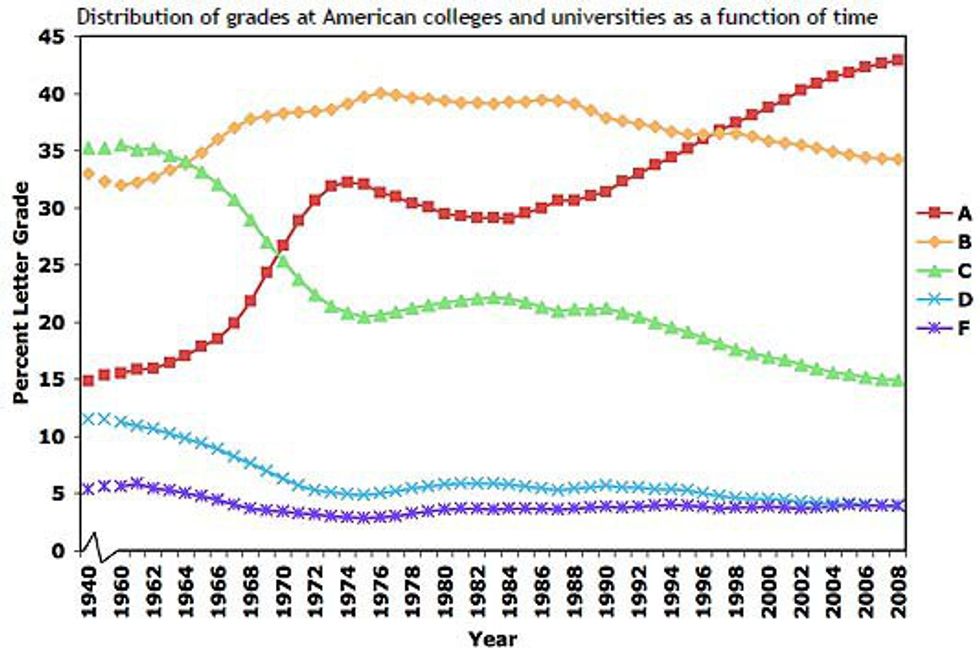 To answer that question applied to modern times, I crawled the Internet to find something comparing education levels of colleges throughout the years. It didn't take long for things to start smelling sour. Several articles tattooed the first page of Google, and spoke very academically about grade inflation.