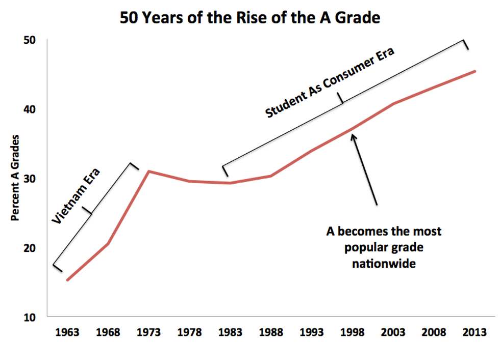 "In the Vietnam era, grades rose partly to keep male students from flunking out (and ending up being drafted into war). But the consumer era is different. It’s about helping students look good on paper, helping them to 'succeed.'"