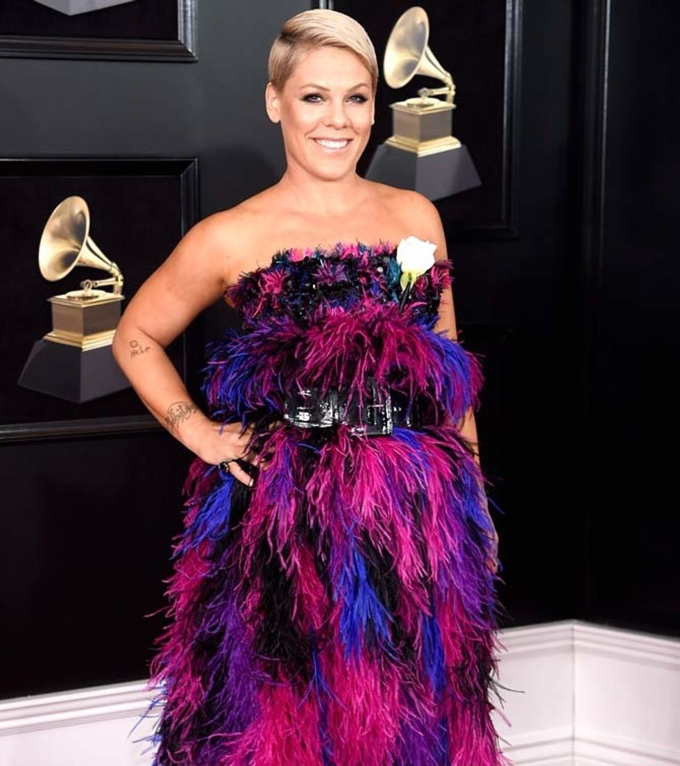 11. Pop singer P!nk wearing an assortment of colorful feathers