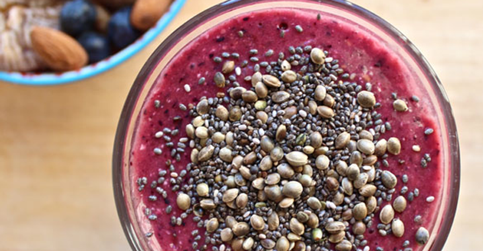 Smoothies with kale can get a bad rep, but just give this one a try. With the acai and berries, you can't even taste the kale but the nutrients are still a great bonus. The acai berries add beneficial antioxidants, as well as healthy omega fats, amino acids, and fiber while the chia seeds adds heart-healthy, omega-3 fatty acids.