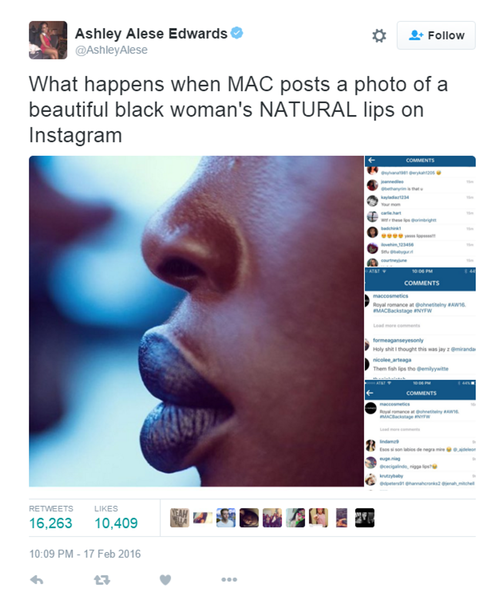 As a black woman, you don’t get to believe you’re beautiful right away. It took me nineteen years to even consider that my skin wasn’t too dark, my nose too wide or lips too big. All we ever see is the continual praise of European feature or even worse, our features praised on anyone else but us. Kylie Jenner’s lips are sexy yet this dark skinned model for MAC Cosmetics with beautiful full lips is disgustingly ridiculed.
