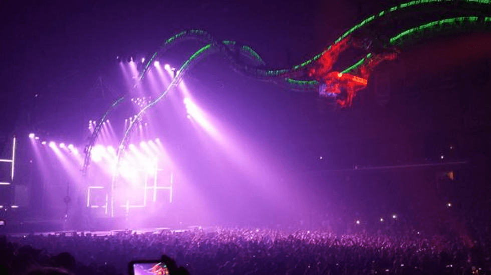 The show started with the sound of motorcycle engines revving, and if you know Mötley Crüe, that can only mean one thing: Girls, Girls, Girls. They opened with this well-known song, and everything after that was just so… glamorous. It didn't have the same vibes as Alice Cooper because Alice is very theatrical and loves shock value. Mötley Crüe was more about the loud screams and the fire and such, which is very characteristic of them. At one point Nikki Sixx, the drummer, flew over the crowd in his drumset, going upside down. I didn’t even know bands could do that! It’s a little difficult to see in the photo below, but that is Nikki Sixx, upside down, playing his drums hundreds of feet over the crowd.