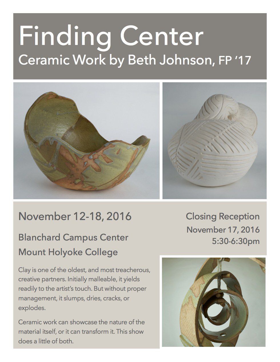 Join Beth in her celebration by checking out Finding Center at the Blanchard Art Gallery of Mount Holyoke College between November 12-18, with a closing reception on Thursday, November 17 at 5:30pm.