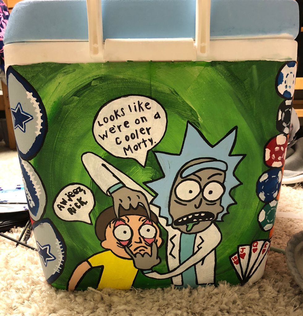 Start with the backgrounds. For me, I did the adult cartoon characters Rick and Morty on one of the small sides so I started with the light green/dark green swirl for the background. On the other small side, I used an orange and pink background. On the large side on the back, I did a plain orange background, the top was plain blue and the front- this was the hard part- I did a Texas flag because my date is from Dallas