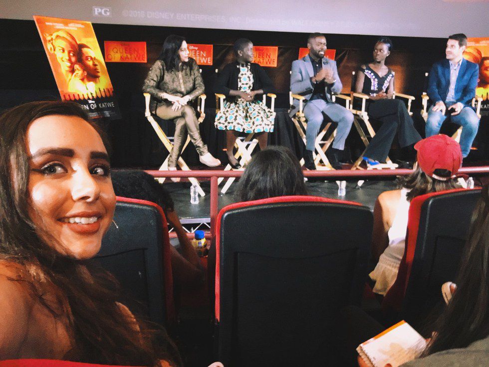 Hey guys. Long time no chat. So I attended the "Queen of Katwe" movie premiere in the very front (!!!) row! It was at AMC Century City and my Uber ride there was lit thanks to the fact the driver had an aux! Slaying with that Drake and Lil Uzi Vert this week, fam. I got to meet the cast, including the fabulous LUPITA NYONG'O, DAVID OYELOWO, MADINA NALWANGA, and more, and even got to interact with Fiona, the Ugandan girl who the movie is based off of—she is a real star! The stars were so humble, and played the village people of Katwe amazingly well. One panelist commented how Nyong'o both struts the red carpet and seamlessly fits in as a maize-selling single mother in the Ugandan village! How cool that she can fit into both atmospheres so effortlessly?! Also... I got to sit in the director's chair and walk the red carpet.... An extraordinary day in the life! :)