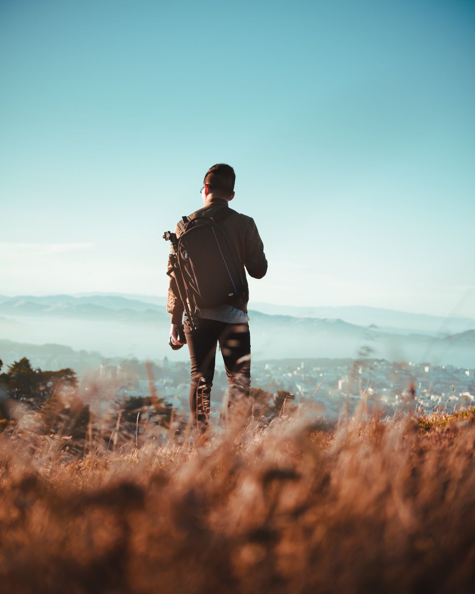 man standing on dried grass field while watching aerial view of village at daytime; California dreaming