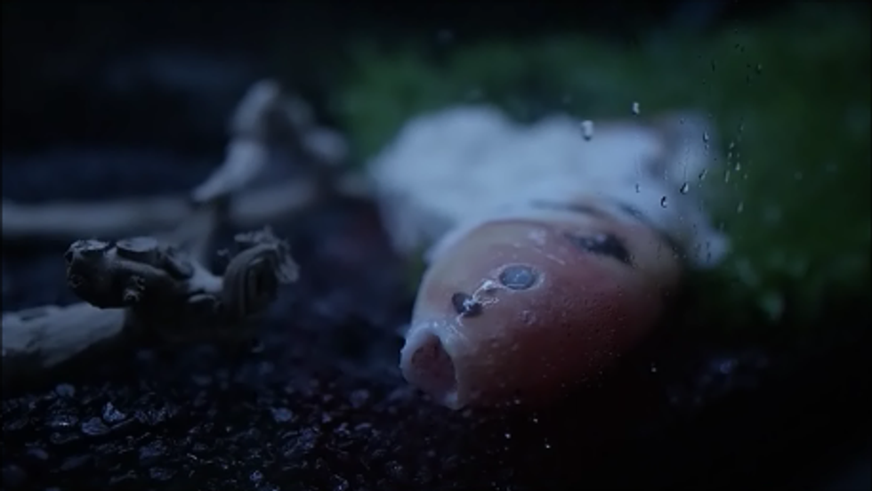 Angela has reached her destination; it's a suburban home with far too much white cabinetry to belong to a parent. She's locked in a dark room with only two chairs, an old computer and a fish tank. The drip drop of the fish tank sounds like a clock ticking and that makes me think of Whiterose. Everything on the desk is outdated, a rotary dial phone, a typewriter, the book Lolita (back when people thought it was daring and sexy to talk about sex with minors) and a floppy disk. She's staring at a "Hang In There" poster when a young girl (Mabel Tyler) enters. They don't have much time. "Have you ever cried during sex?" is the first question and there are more, if Angela doesn't answer, she'll be beaten The phone rings and they continue
