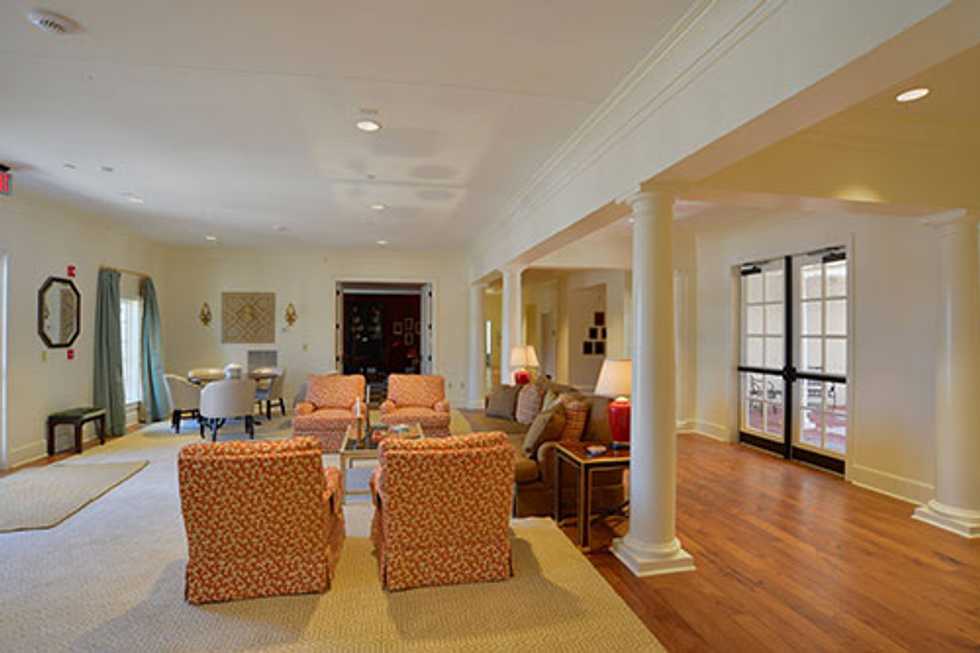 The Chi Omega house is a characteristic mansion-style with white columns and a beautifully landscaped front yard. It has two front balconies perfect for enjoying a warm day, and of course for hanging banners. When you first walk into the house there is a square balcony overlooking the foyer, called the “Owl's Nest." Another fun fact: the stairs leading up to this balcony have a beautiful leopard print design!