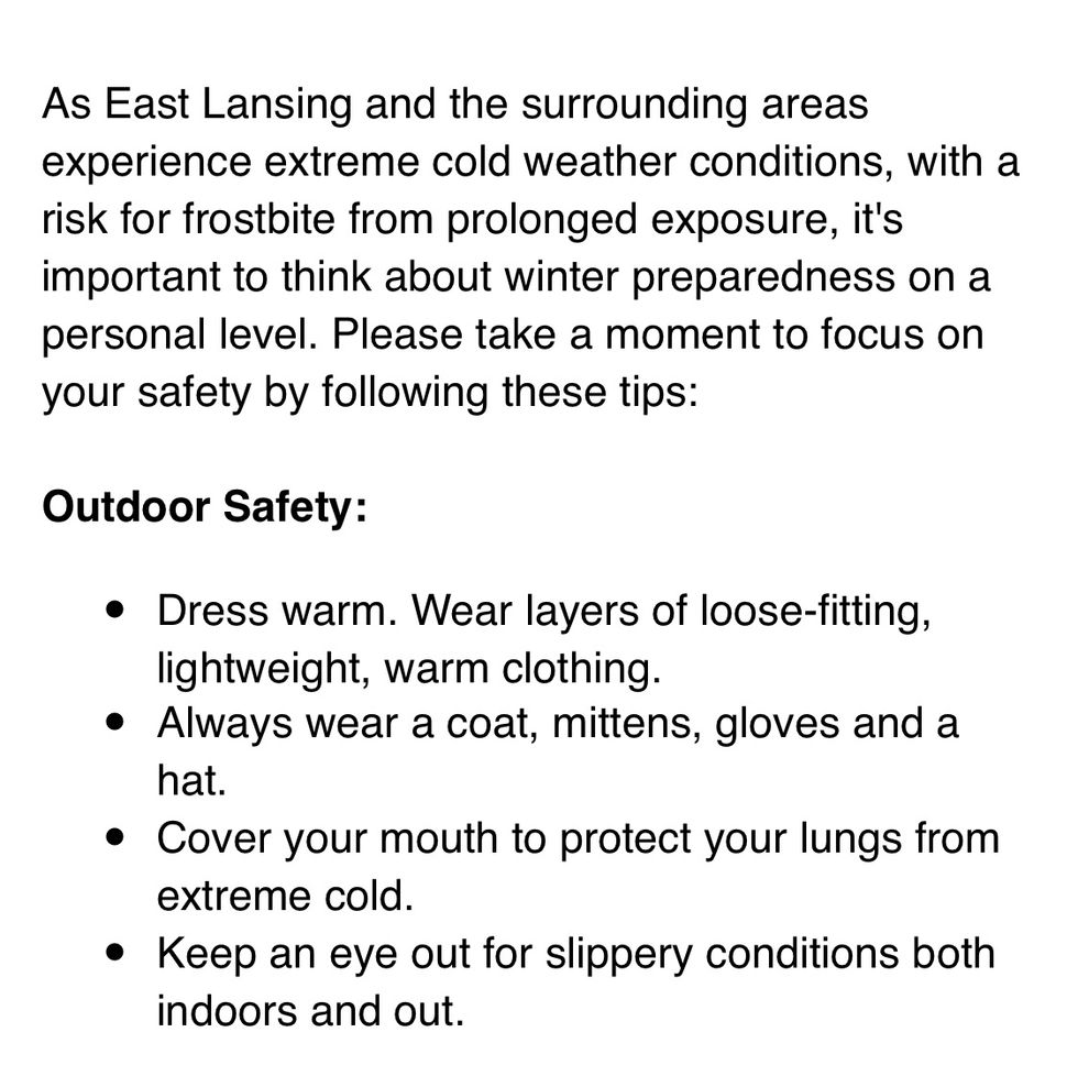 On Sunday, January 27th with a forecast for the next day calling for 8 inches of snow and wind chills well below zero degrees, MSU sent out the following email to all staff members and students:
