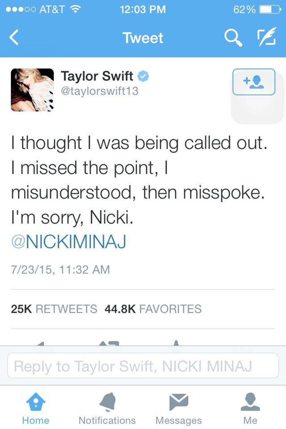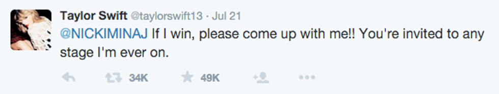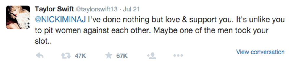 Update 7.23.15 at 12:05 p.m. - Taylor tweeted an apology to Nicki about the misunderstanding -
