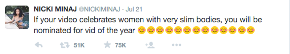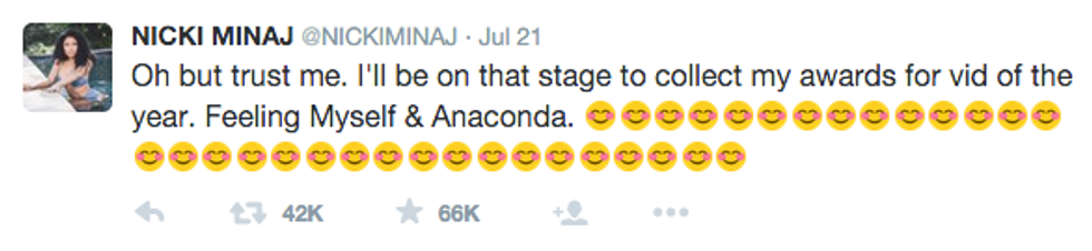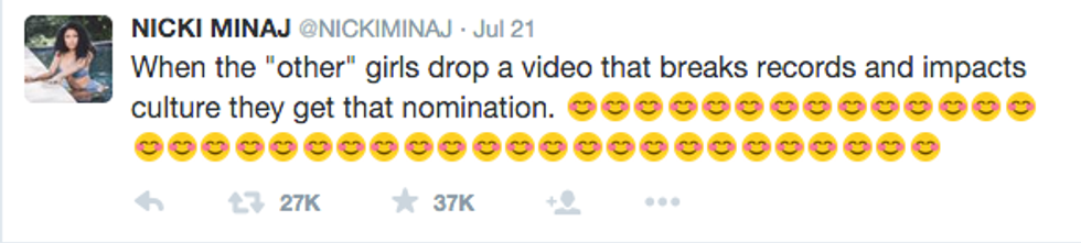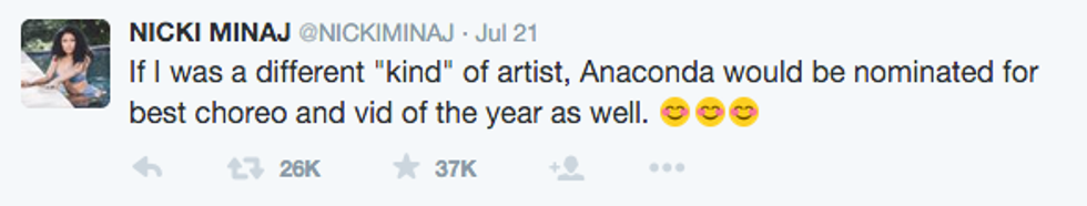 On Tuesday, July 21st, the VMA nominations were released for the world to see and their seemed to be controversy over the Video Of The Year nominees. The nominees for that honor include Taylor Swift, Beyonce, Ed Sheeran, Mark Ronson ft. Bruno Mars and Kendrick Lamar. But, what about Nicki Minaj and her legendary Anaconda music video? This isn't just any old music we're talking about, this video was record setting. Anaconda put a raunchy twist on pop culture portayals of curvy black women. This song received 19.6 millions views within the first 24 hours. Nicki and her fans were floored when they found out this song wasn't nominated. Nicki, without a doubt, had a reason to be upset, which she made very clear via Twitter.