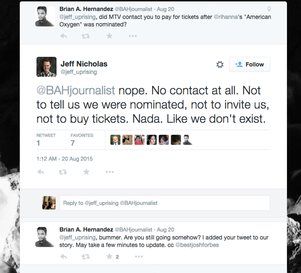 The real issue is that MTV and so many others do not recognize the directors and the production assistants that make the video a reality. Typically the band or the artist are the only ones who receive the fame and money. Brian Hernandez a reporter at Mashable tweeted Jeff Nicholas, director of the music video "American Oxygen" by Rihanna, asking if he was contacted to pay for tickets after the videos nomination. Nicholas reply is startling based solely on the fact that MTV did not even contact the director.