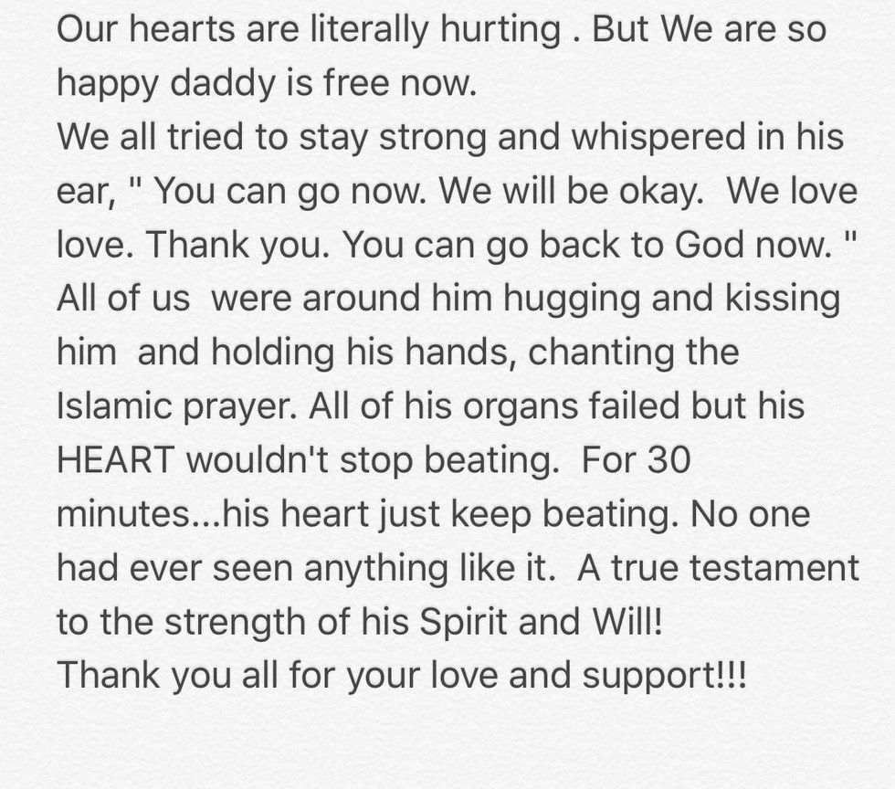 Overall, Ali has enlightened the public to always push yourself and never give up, as he did in his last moments. Ali's daughter, Hana Ali, posted that Ali's organs had given out earlier, yet his heart was still beating 30 minutes after everything had shut down.Muhammad Ali's family had requested that those who would like "To express your condolences, share your stories, or give a donation for Muhammad Ali’s legacy please visit alicenter.org".Rest in Power, fighter.
